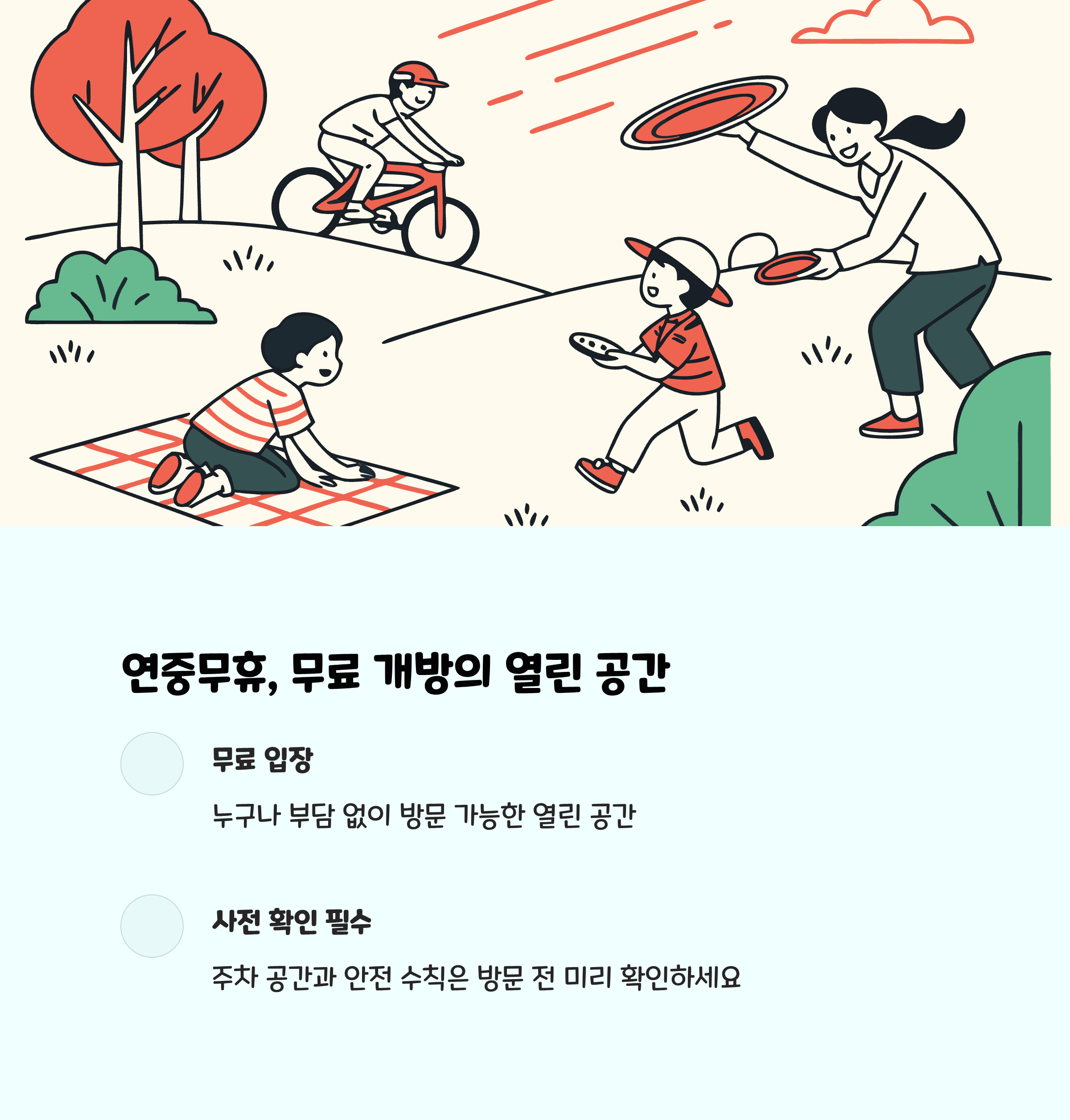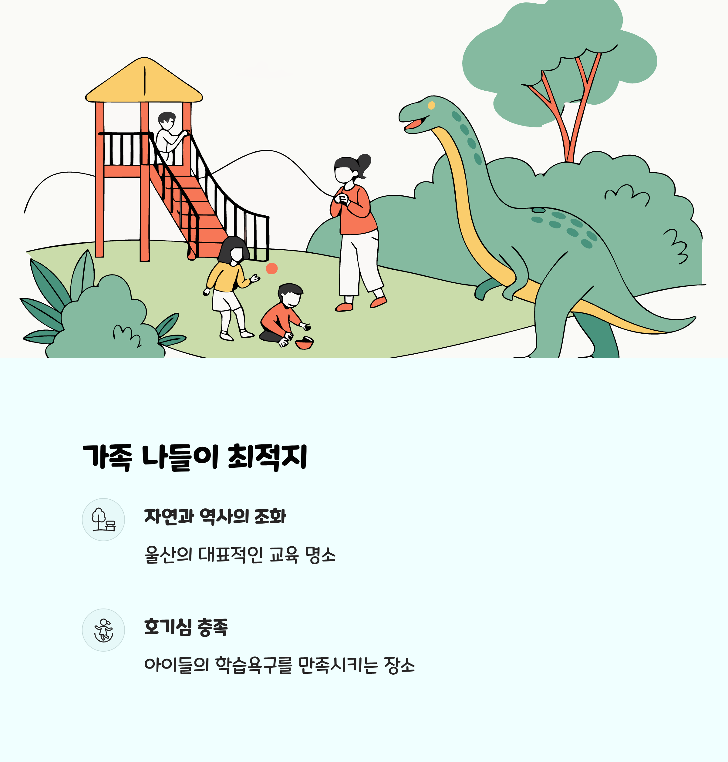 - 넓은 산책로와 쉼터, 가족 나들이와 교육 목적에 적합