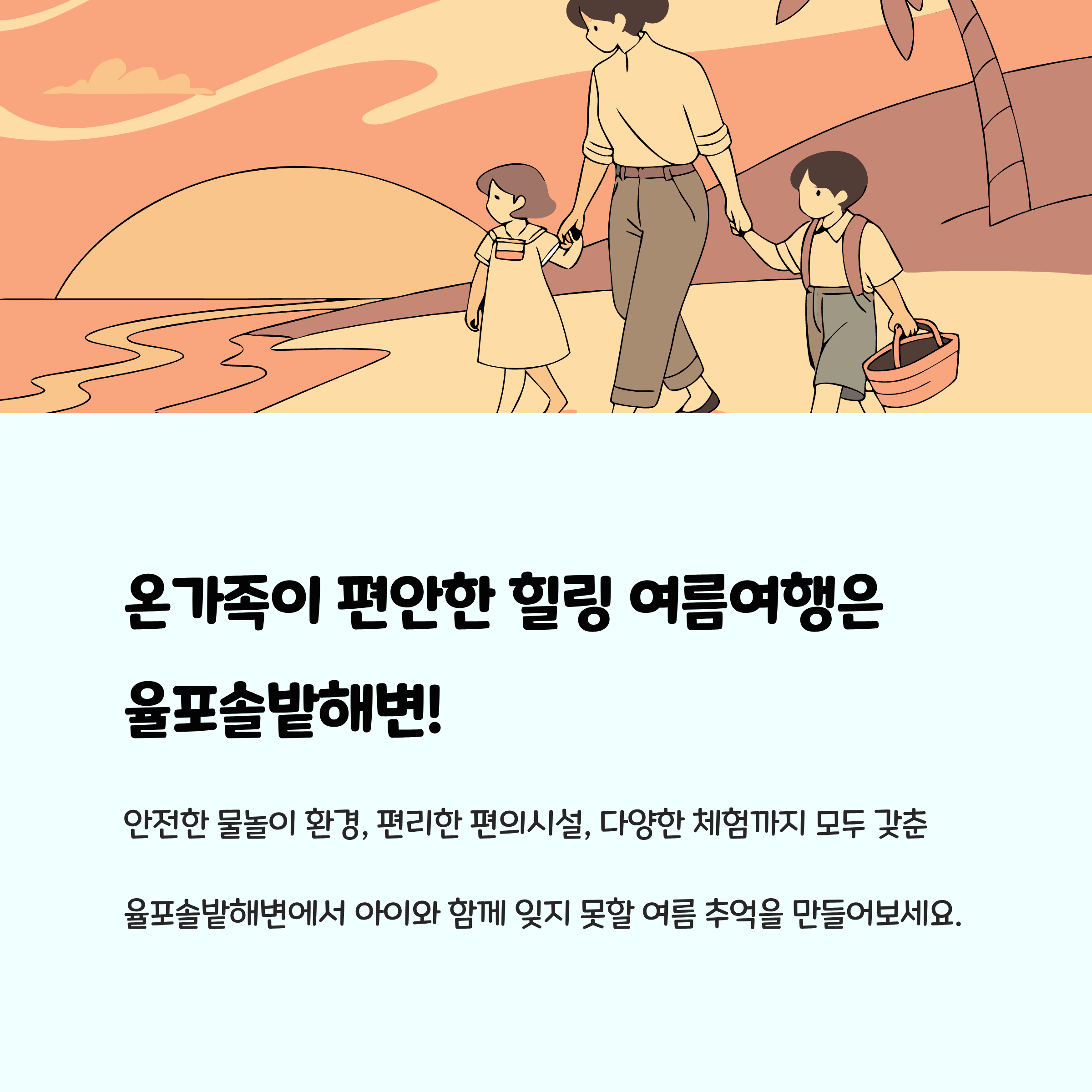 여름휴가를 준비하면서 가장 고민되는 부분은 아이와 함께 안전하게 바다를 즐길 수 있는 장소 찾기입니다. 보성 율포솔밭해변은 얕고 넓은 모래사장, 철저한 안전관리, 깨끗한 물놀이 공간을 갖춰 어린 자녀와 방문하기에 안성맞춤입니다. 편의시설과 다양한 놀이시설도 잘 구비되어 있어 가족 모두가 편안하고 즐겁게 여름휴가를 보낼 수 있는 최적지입니다.