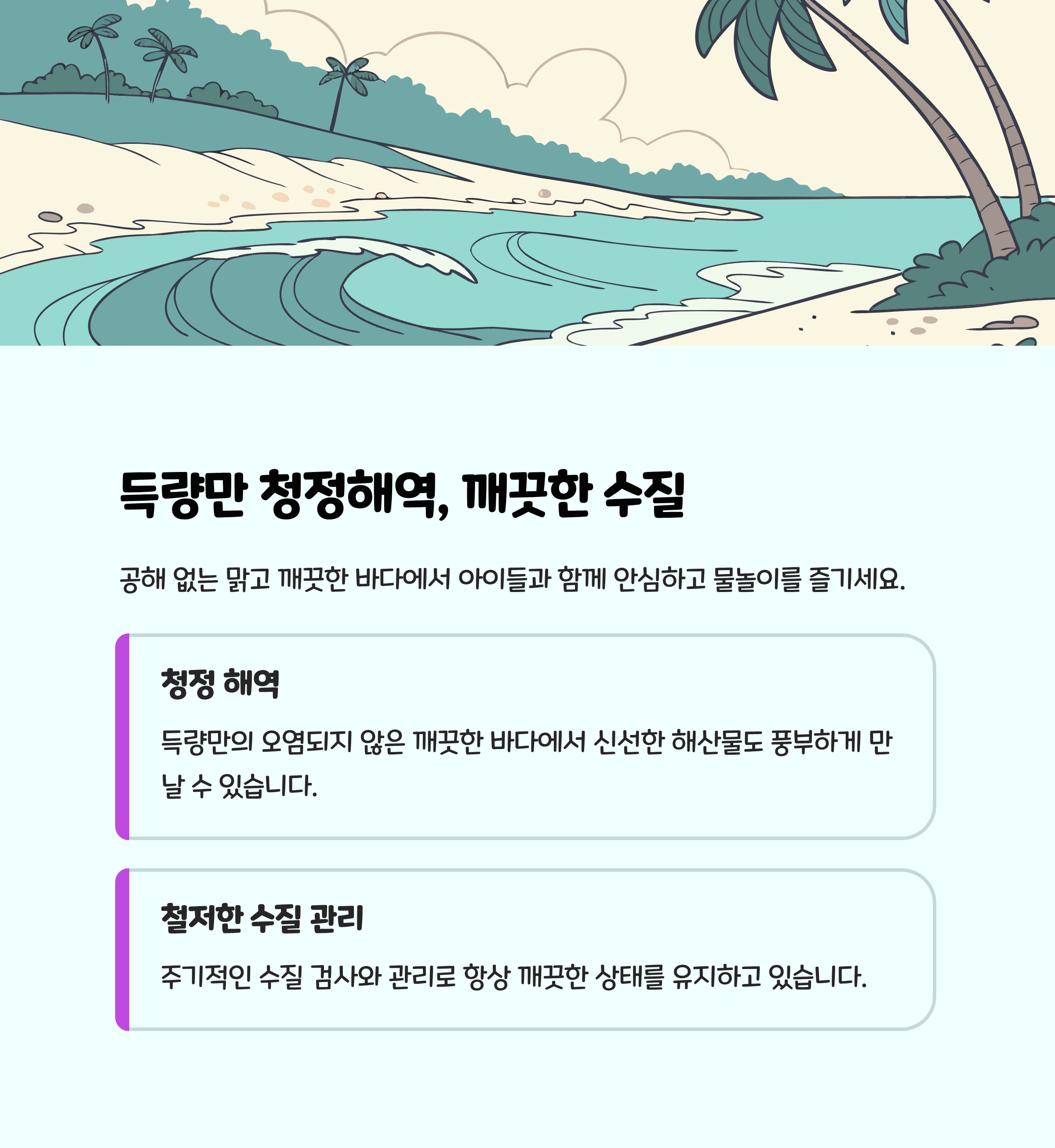 해수풀장은 지하 120m에서 끌어올린 암반 심해수를 사용하며, 여름철 유행하는 눈병, 피부병 등 질환 예방에도 안전합니다. 수질 관리는 매일 이루어집니다.