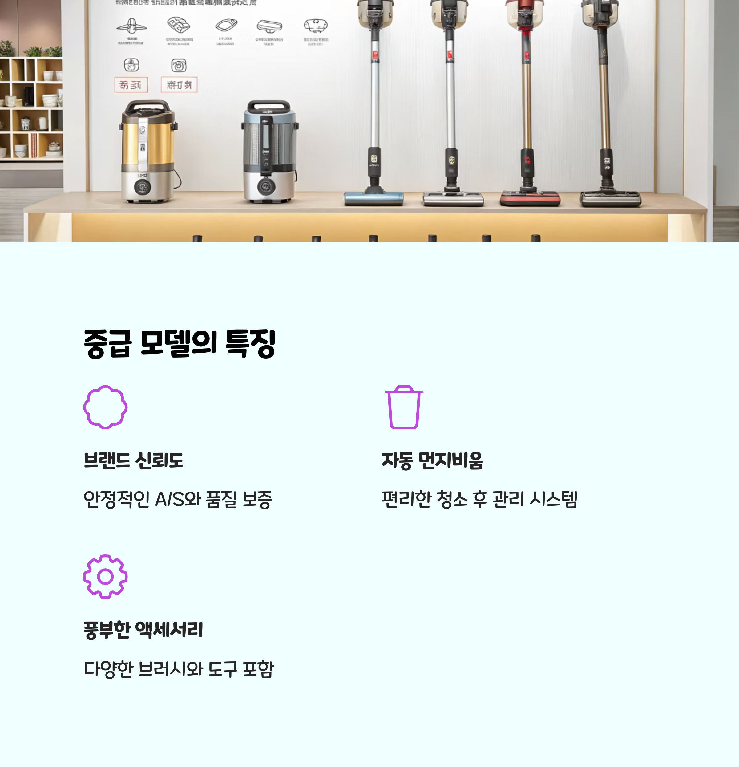 - 최고급 모델 대비 흡입력이 약간 떨어짐