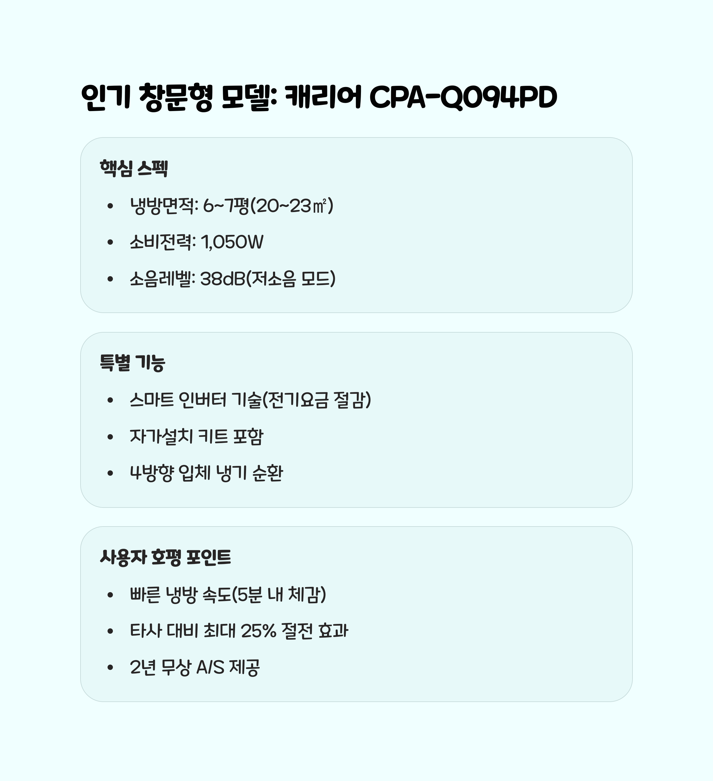 작은방에서 저소음, 강력 냉방, 간편 설치, 세련된 디자인까지 모두 잡고 싶다면, 최신 창문형 또는 이동식 에어컨이 최적의 선택입니다. 특히 캐리어 CPA-Q094PD(창문형), 미니아 이동식 에어컨(이동식)은 실제 사용자들의 만족도가 높고, 에너지 효율과 소음, 공간 활용성 모두 뛰어납니다. 초저소음, 초저전력에 집중한다면 냉풍기나 스마트 팬도 좋은 대안이 될 수 있습니다