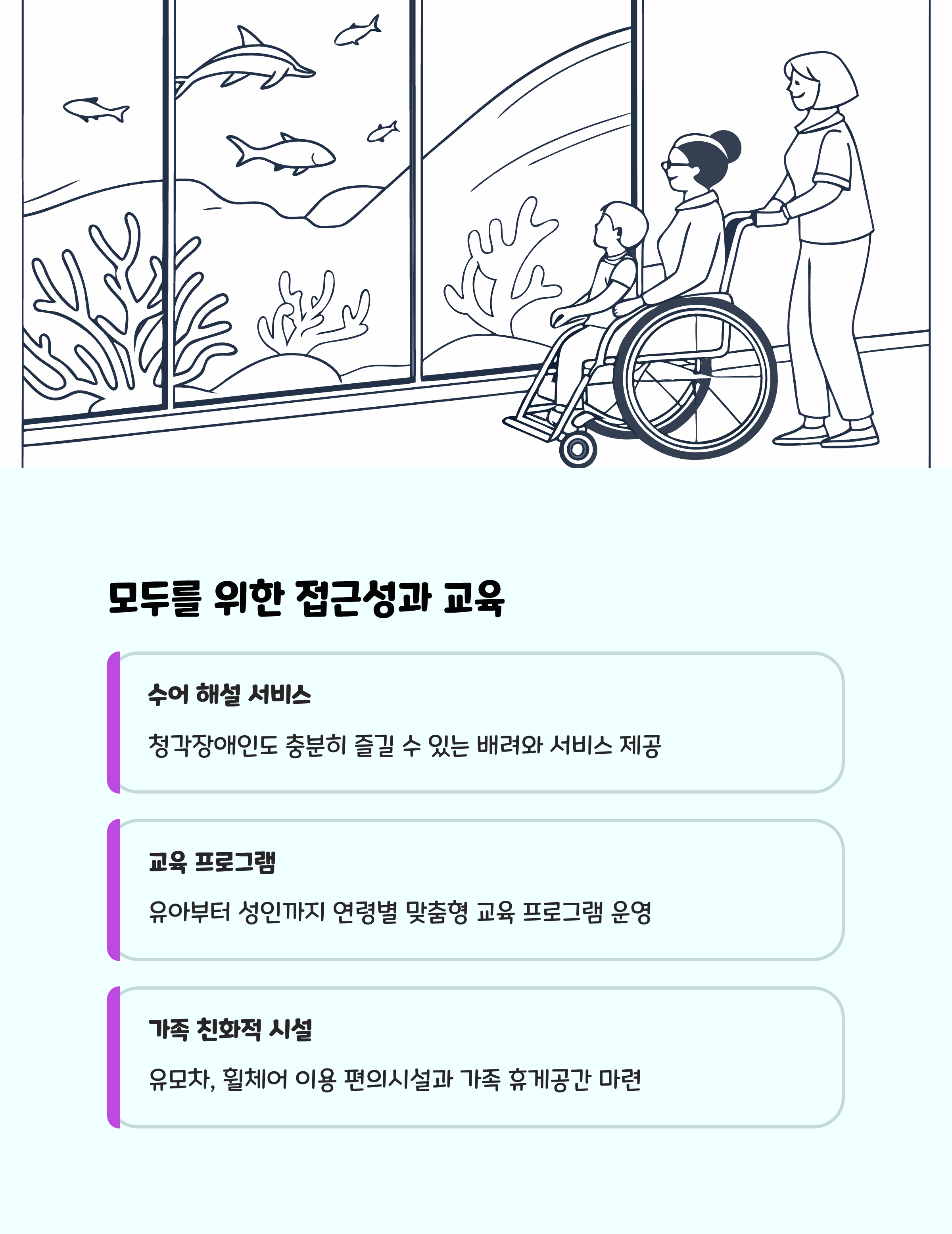 | 주요 체험 | 실제 돌고래 4마리 관람, 4D·VR 영상 체험, 수어 해설 서비스 |