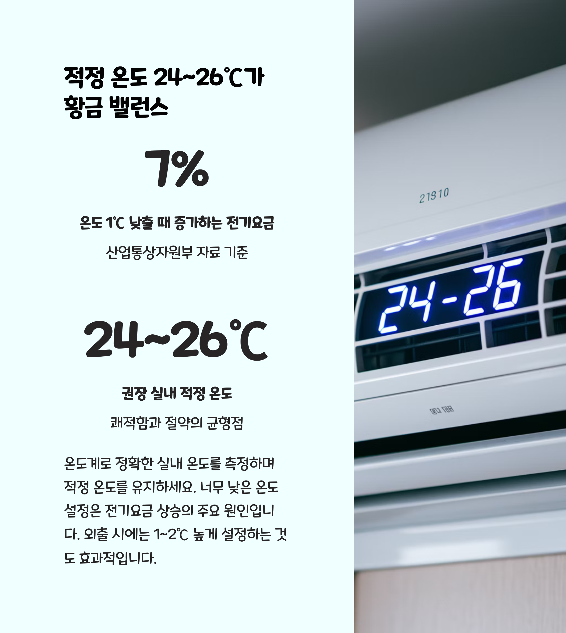 에어컨 온도를 1도 낮출 때마다 전기 사용량이 약 7~8%씩 증가합니다. 예를 들어, 26도에서 24도로 낮추면 전기세가 약 15% 더 나올 수 있습니다.