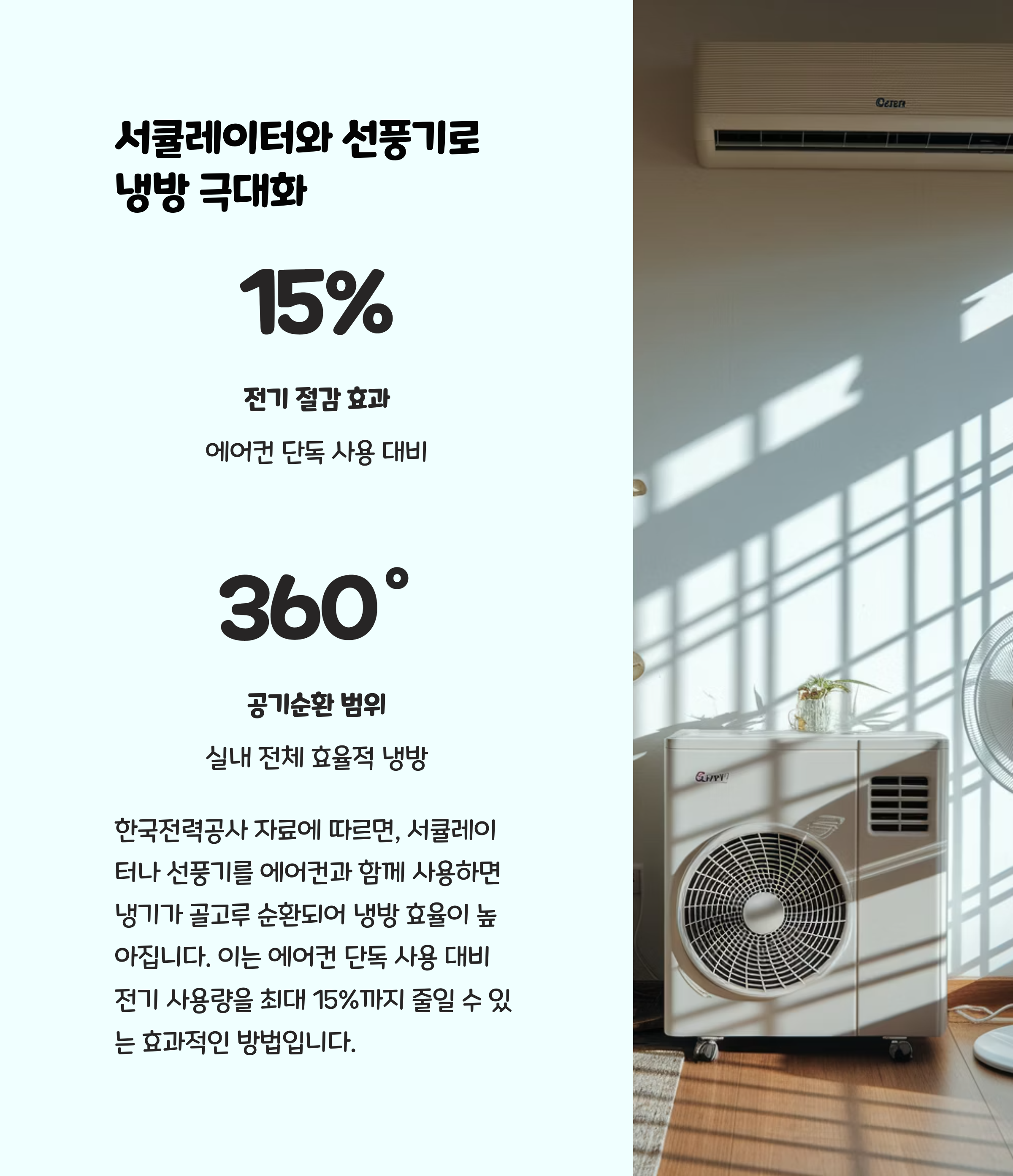에어컨과 서큘레이터(공기순환기) 또는 선풍기를 함께 사용하면 실내 공기가 빠르게 순환되어 온도가 고르게 분포됩니다. 에어컨만 사용할 때보다 실내 온도가 1~3도 더 낮아지고, 에너지 효율은 20~30% 증가합니다. 선풍기는 에어컨에 비해 전력 소모가 매우 적으므로 적극적으로 활용하는 것이 좋습니다.