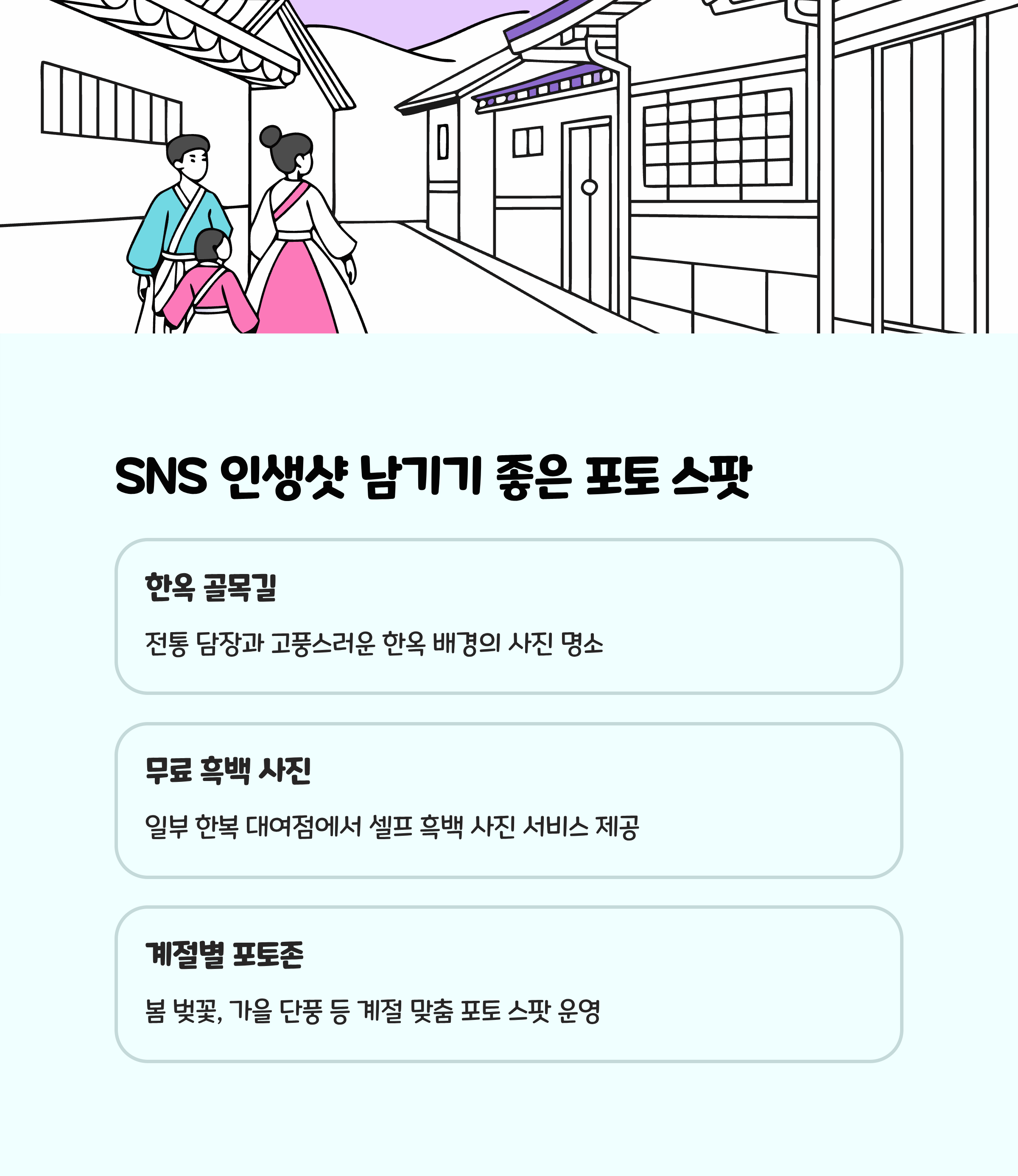 주차: 주변 공영주차장을 이용하면 혼잡을 피할 수 있습니다.숙박: ‘한옥스테이’ 프로그램을 예약하면 1박 10만원대부터 실제 한옥에서 숙박하며 전통 체험을 더 깊게 즐길 수 있습니다.먹거리: 전주비빔밥, 한옥마을 야시장, 전통 간식(쌍화차, 오징어, 초코파이 등)은 남녀노소 모두 인기!날씨: 비 소식이 있다면 한복 예약 변경 가능 여부를 미리 문의하세요. 실내 체험도 풍부해 우천 시 대안이 많습니다.