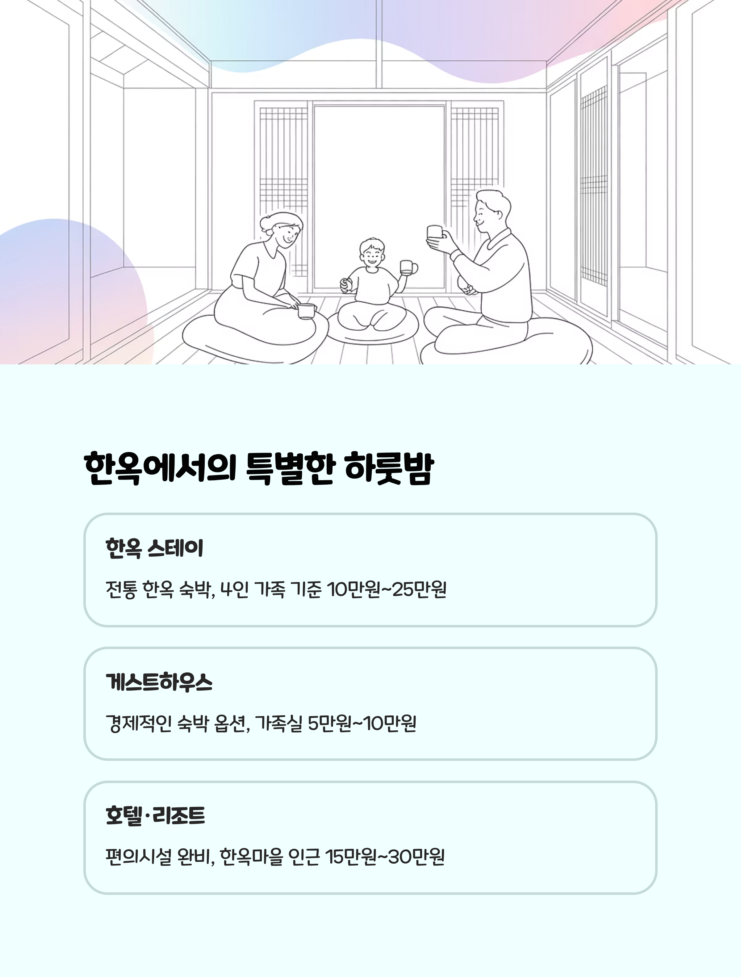 주차: 주변 공영주차장을 이용하면 혼잡을 피할 수 있습니다.숙박: ‘한옥스테이’ 프로그램을 예약하면 1박 10만원대부터 실제 한옥에서 숙박하며 전통 체험을 더 깊게 즐길 수 있습니다.먹거리: 전주비빔밥, 한옥마을 야시장, 전통 간식(쌍화차, 오징어, 초코파이 등)은 남녀노소 모두 인기!날씨: 비 소식이 있다면 한복 예약 변경 가능 여부를 미리 문의하세요. 실내 체험도 풍부해 우천 시 대안이 많습니다.