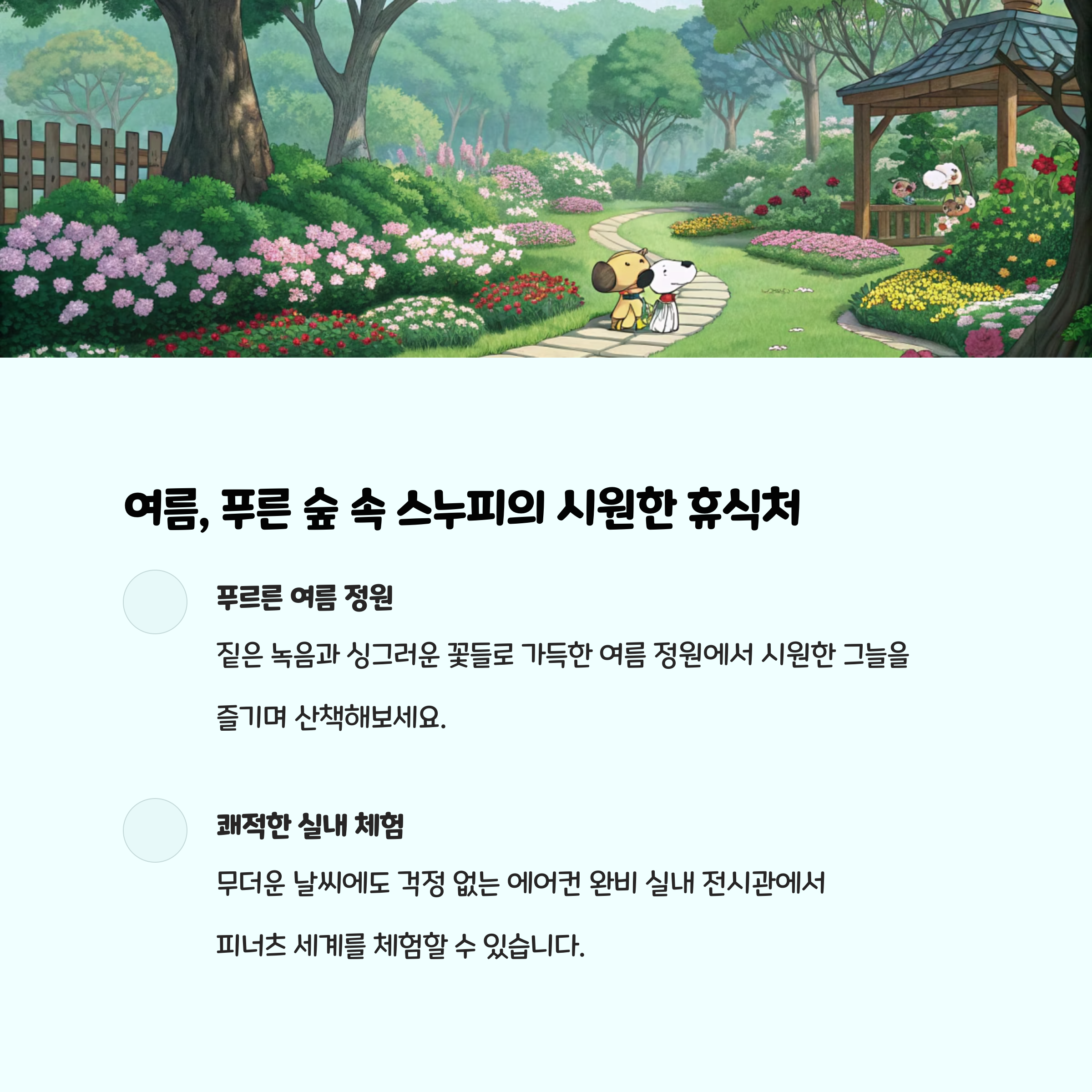 여름(6~8월)은 제주 특유의 푸르른 녹음이 정원을 가득 채웁니다. 실외 활동이 부담스럽다면 실내 전시관에서 쾌적하게 피너츠 만화와 다양한 체험을 즐길 수 있어, 무더위에도 걱정 없이 방문 가능합니다.