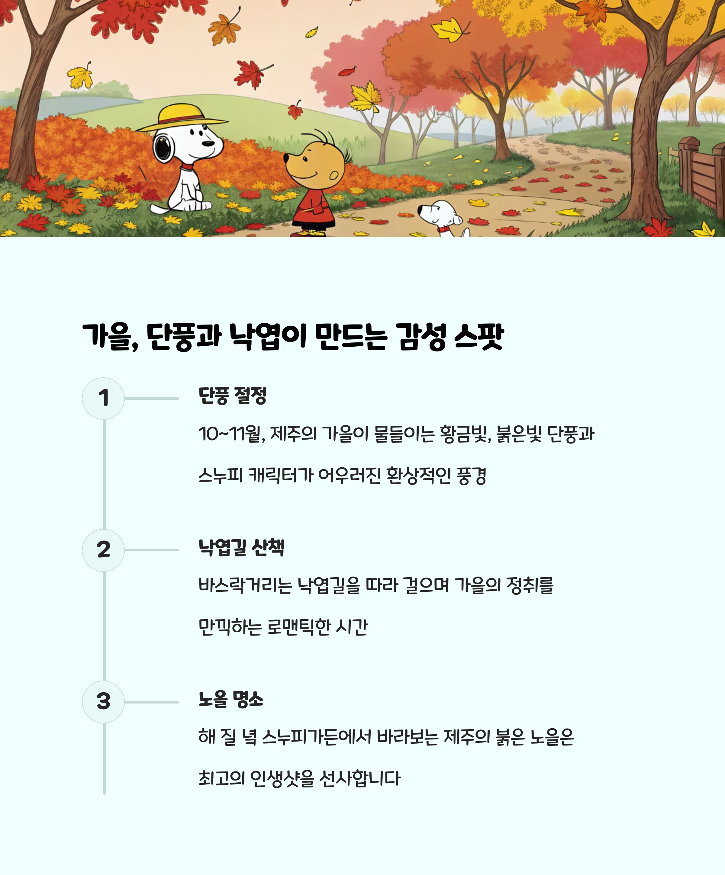 가을(9~11월)은 제주 야외 정원이 단풍과 낙엽으로 물들어 사진 찍기 좋은 명소로 변신합니다. 특히 10월~11월에는 선선한 바람과 함께 걷기에 최적이며, 스누피와 친구들이 어우러진 가을 풍경이 특별한 추억을 남깁니다.