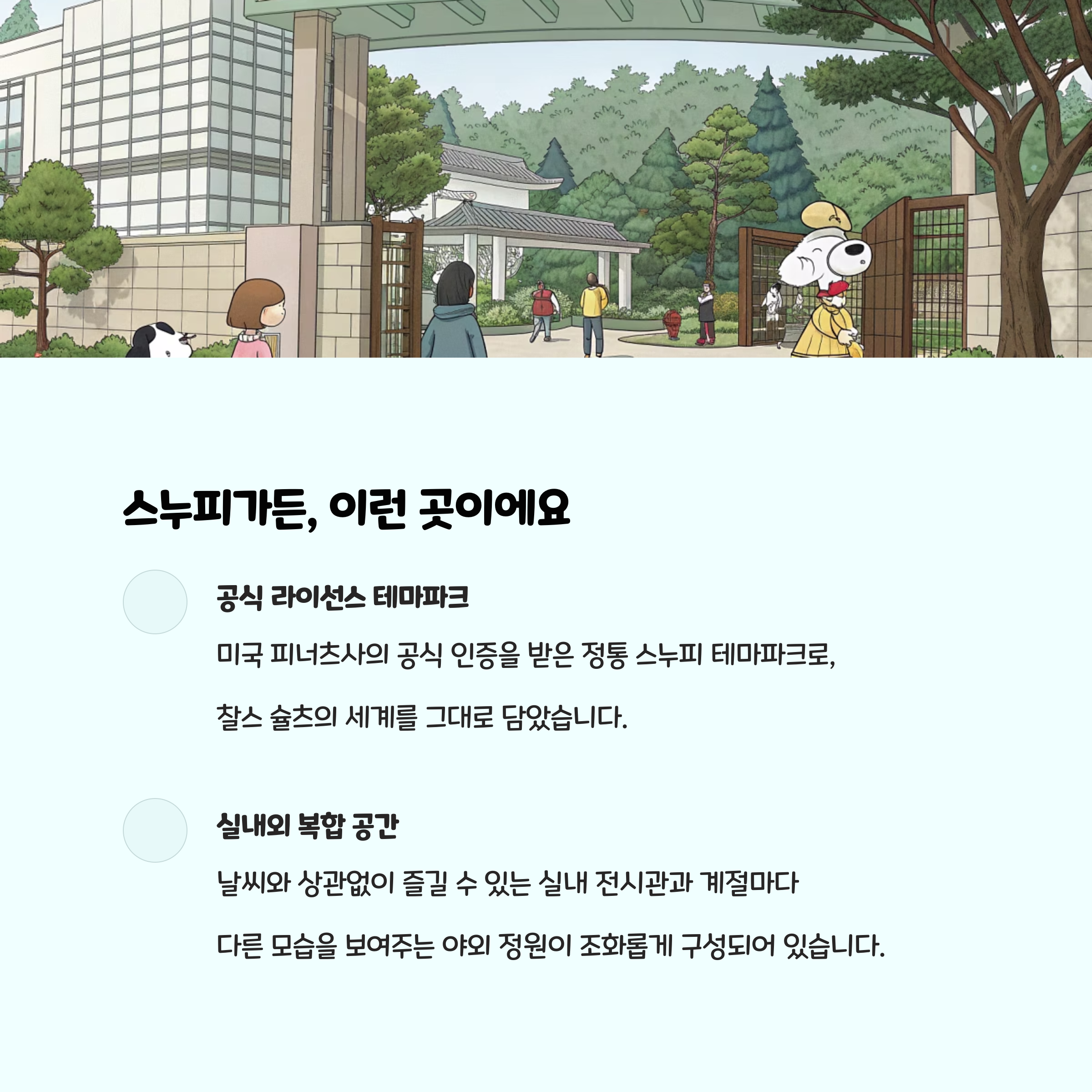 스누피가든은 실내 전시관과 야외 정원이 결합된 테마파크로, 약 25,000㎡(7,562평) 규모의 자연 속에서 피너츠 만화의 감성을 오감으로 체험할 수 있습니다. 계절마다 자연의 변화가 뚜렷해, 방문 시기에 따라 전혀 다른 풍경과 분위기를 느낄 수 있다는 점이 가장 큰 특징입니다.