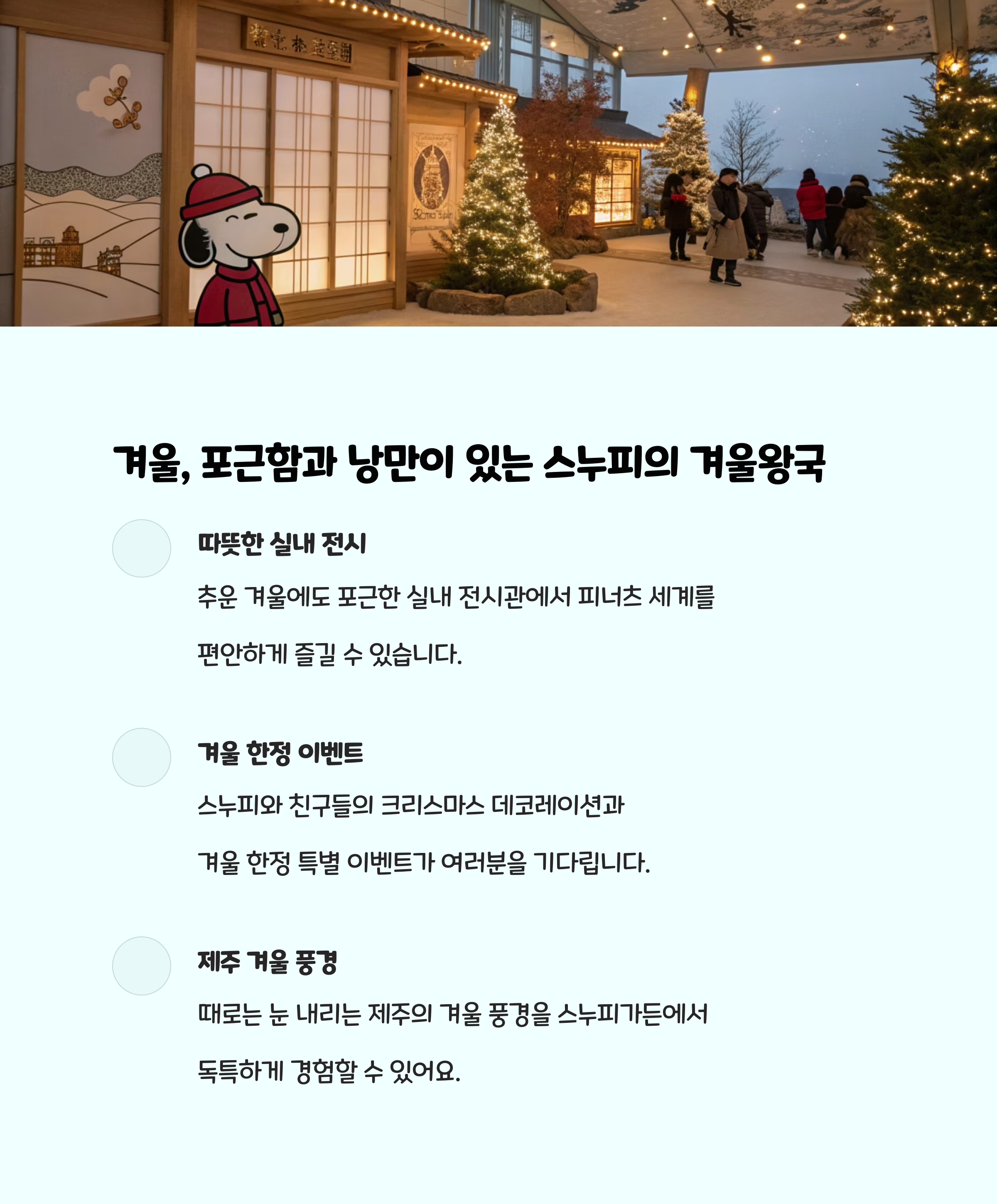 여름(6~8월)은 제주 특유의 푸르른 녹음이 정원을 가득 채웁니다. 실외 활동이 부담스럽다면 실내 전시관에서 쾌적하게 피너츠 만화와 다양한 체험을 즐길 수 있어, 무더위에도 걱정 없이 방문 가능합니다.