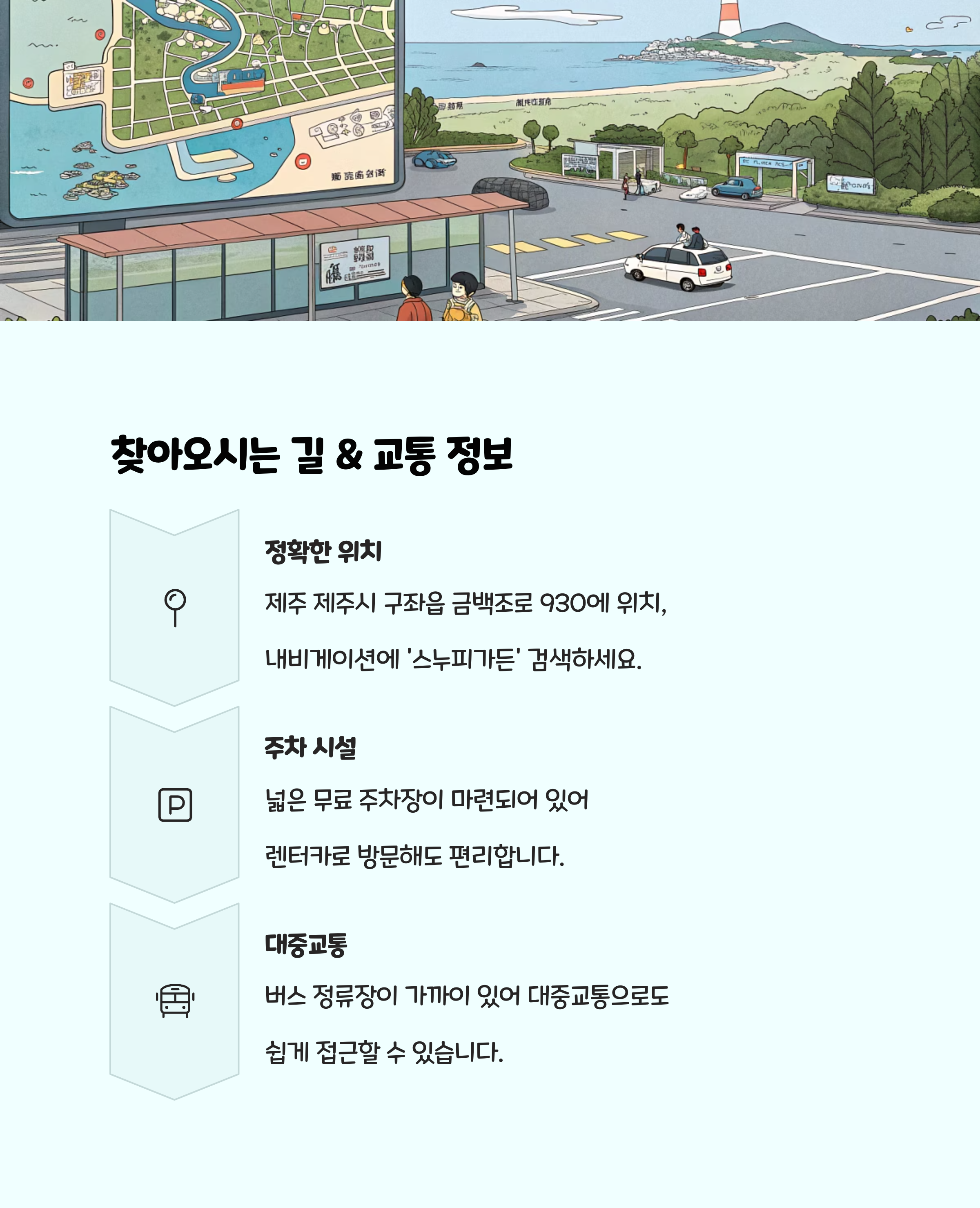 제주 시내에서 스누피가든까지 대중교통(버스)로 이동할 수 있으나, 배차 간격이 길고 환승이 필요해 다소 불편할 수 있습니다. 렌터카나 택시 이용이 훨씬 편리하며, 여행 일정에 맞춰 차량 이동을 추천합니다.