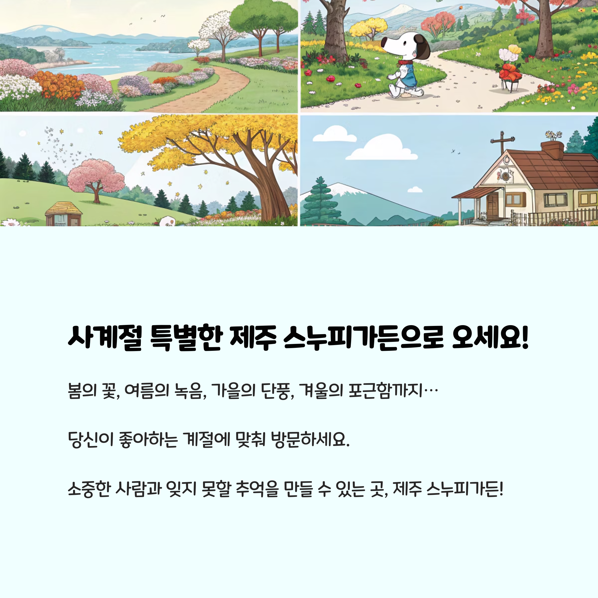 스누피가든은 사계절 내내 각기 다른 매력을 선사합니다. 봄·가을에는 야외 정원의 자연을, 여름·겨울에는 실내외를 오가며 쾌적하게 즐길 수 있습니다. 가족 나들이, 연인과의 데이트, 피너츠 팬 모두에게 추천할 만한 제주 명소입니다. 방문 목적과 동행자, 선호하는 분위기에 따라 계절별 장단점을 참고해 최적의 여행 시기를 선택해보세요.