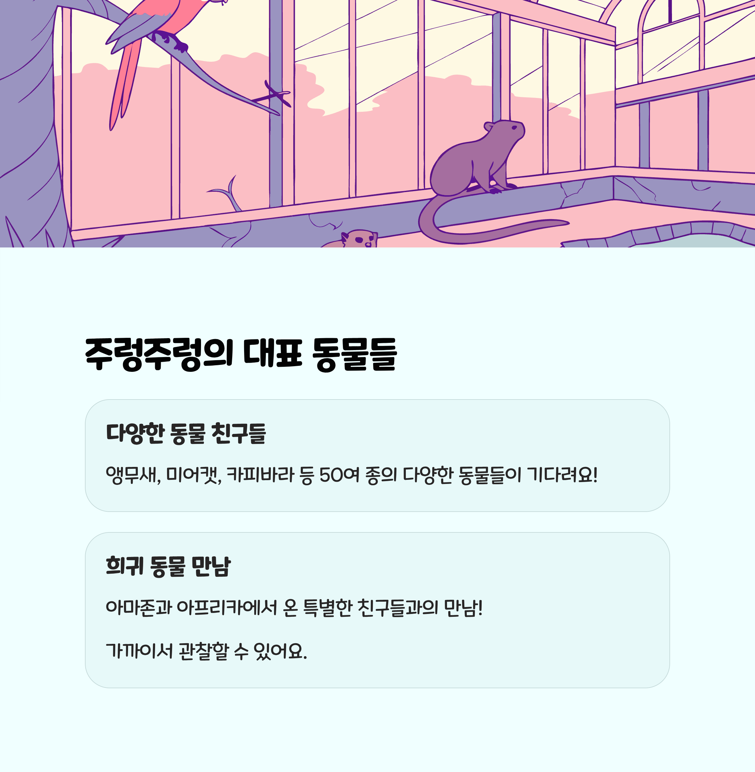 | 동물 종류 | 앵무새, 미어캣, 홍따오기, 토코투칸, 카피바라 등 |