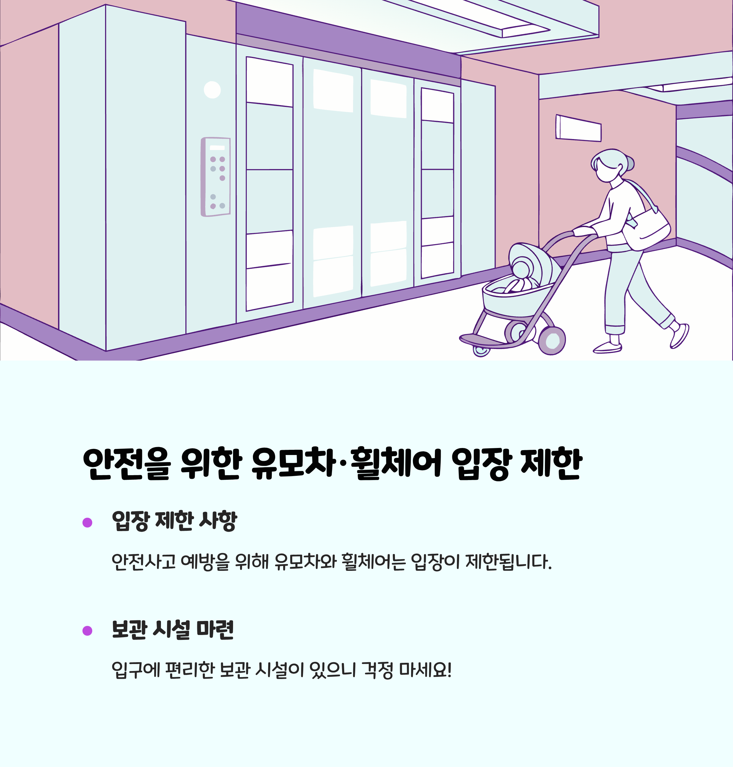 - 유모차와 휠체어는 입장이 제한되어 있으니 참고하세요.