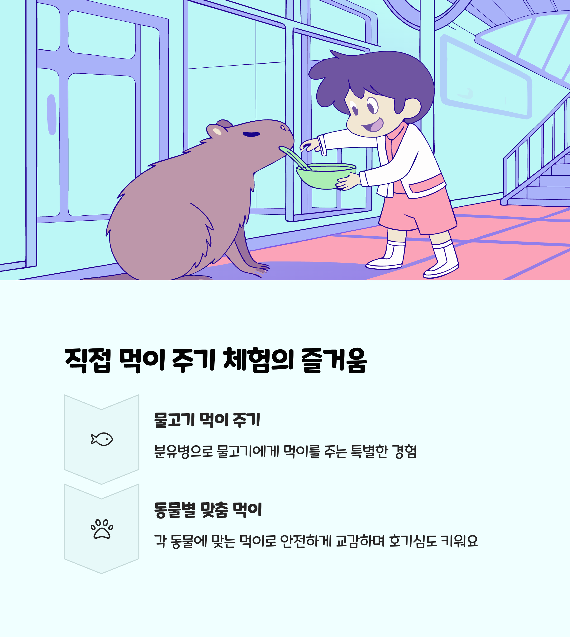 | 주요 체험 | 먹이 주기, 분유병으로 물고기 먹이 체험, 동물 교감 |