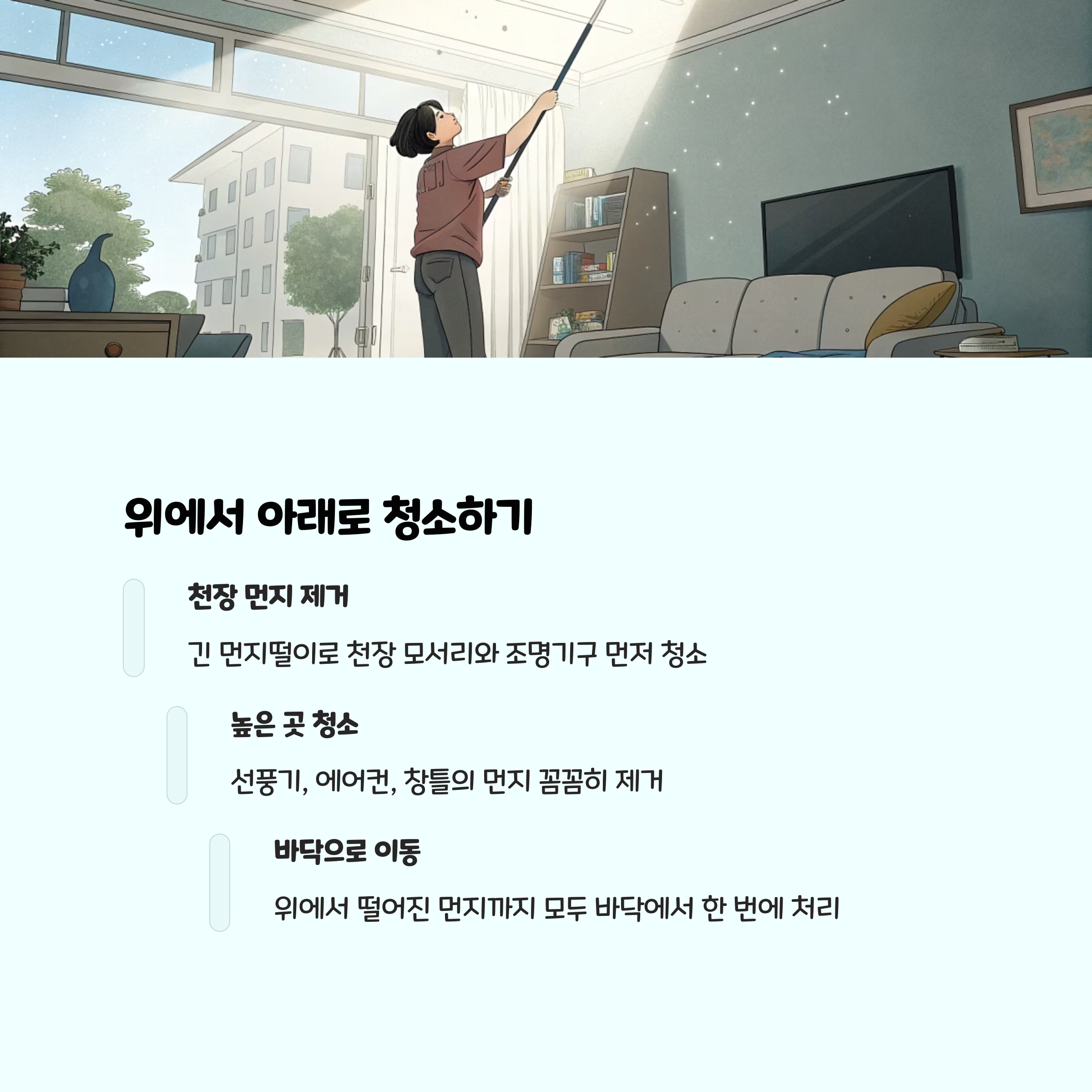 - 청소는 ‘위에서 아래로, 안에서 밖으로’가 원칙입니다. 먼지가 아래로 떨어지기 때문이죠.
