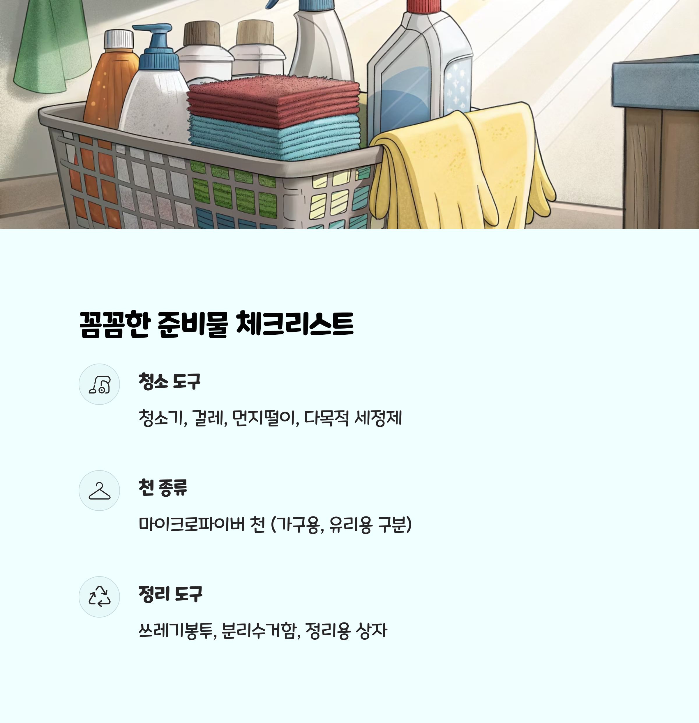 - 진공청소기, 물걸레, 먼지떨이, 쓰레기봉투, 마른 천, 고무장갑, 다목적 세정제 등 기본 아이템을 준비합니다.