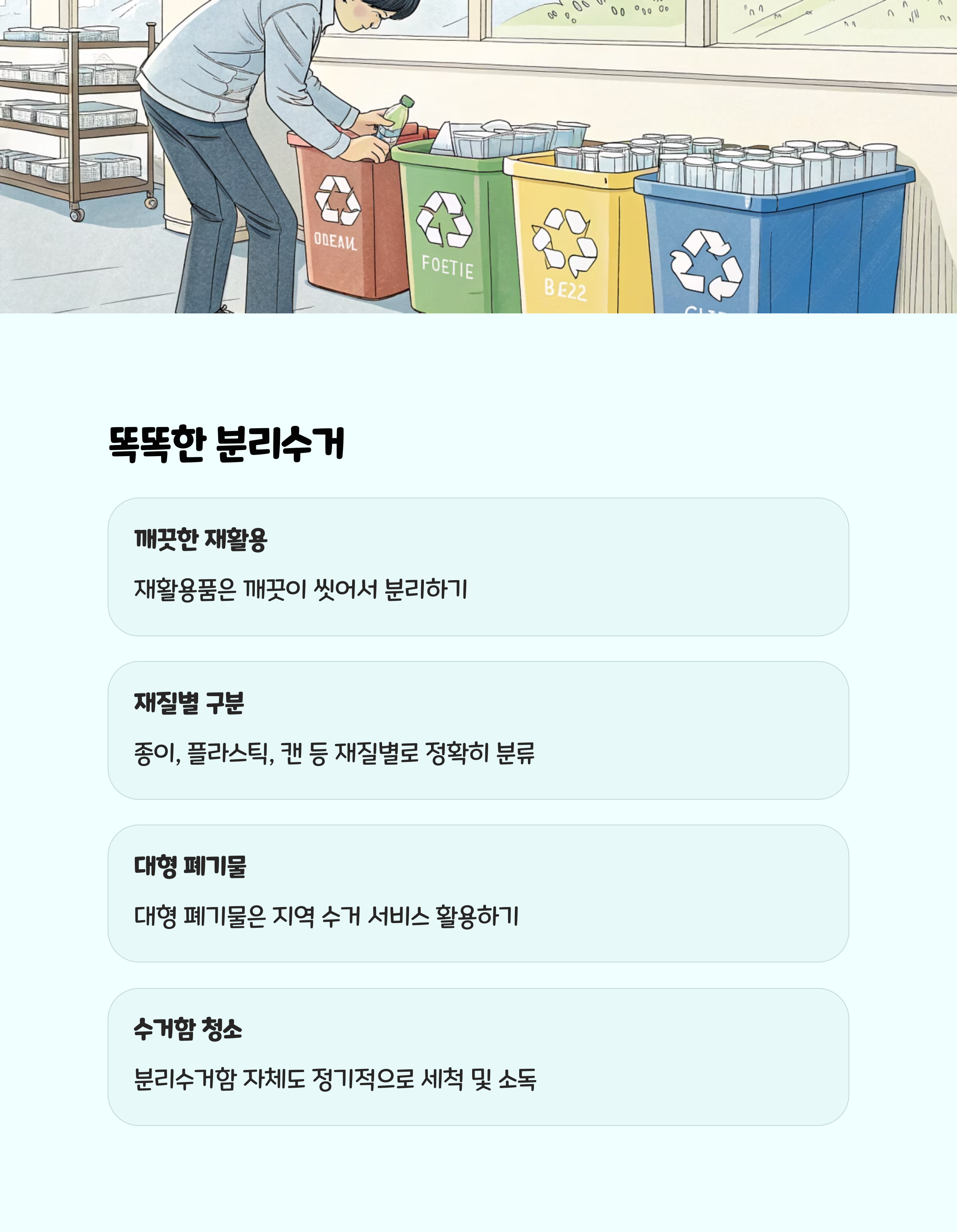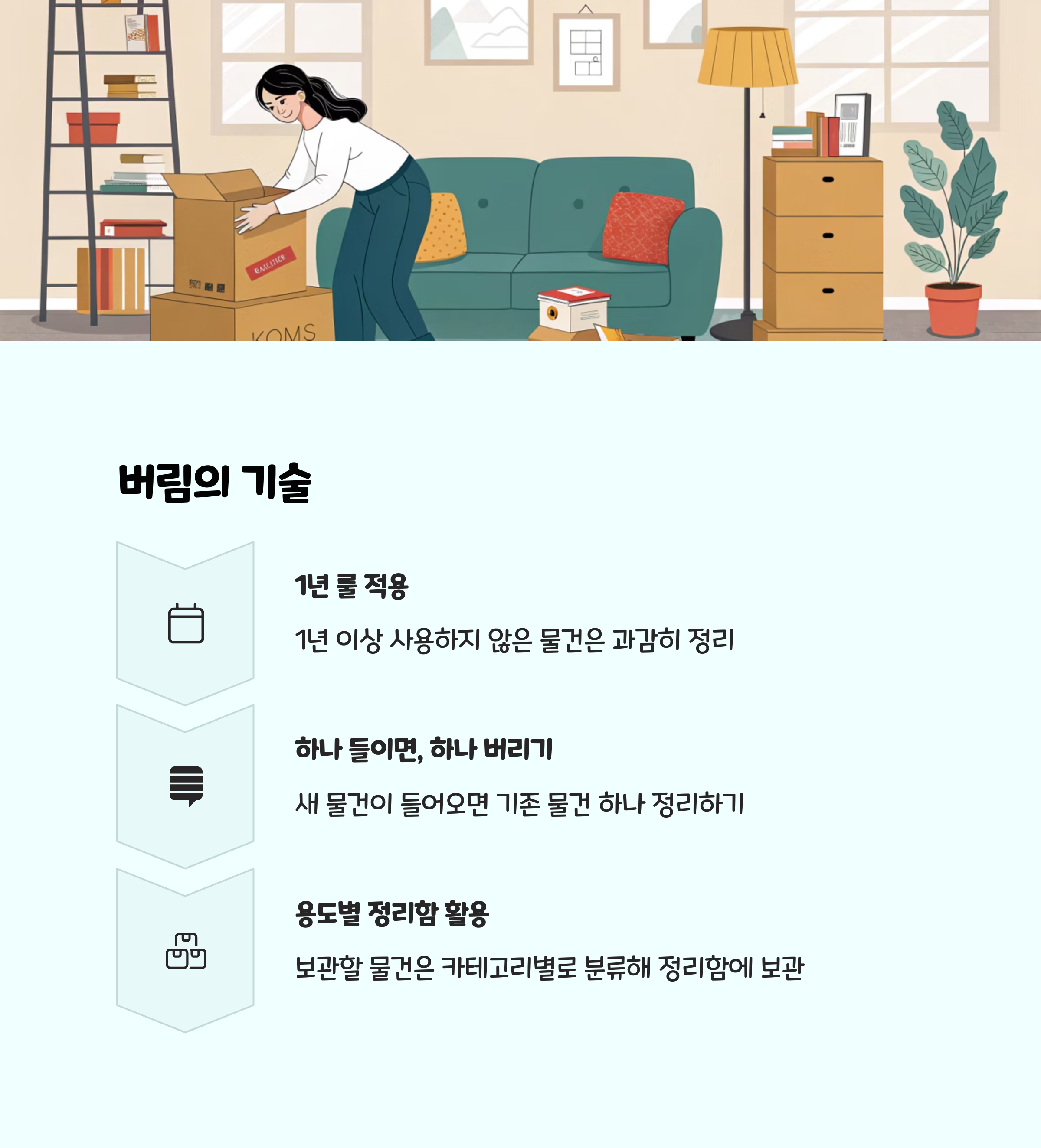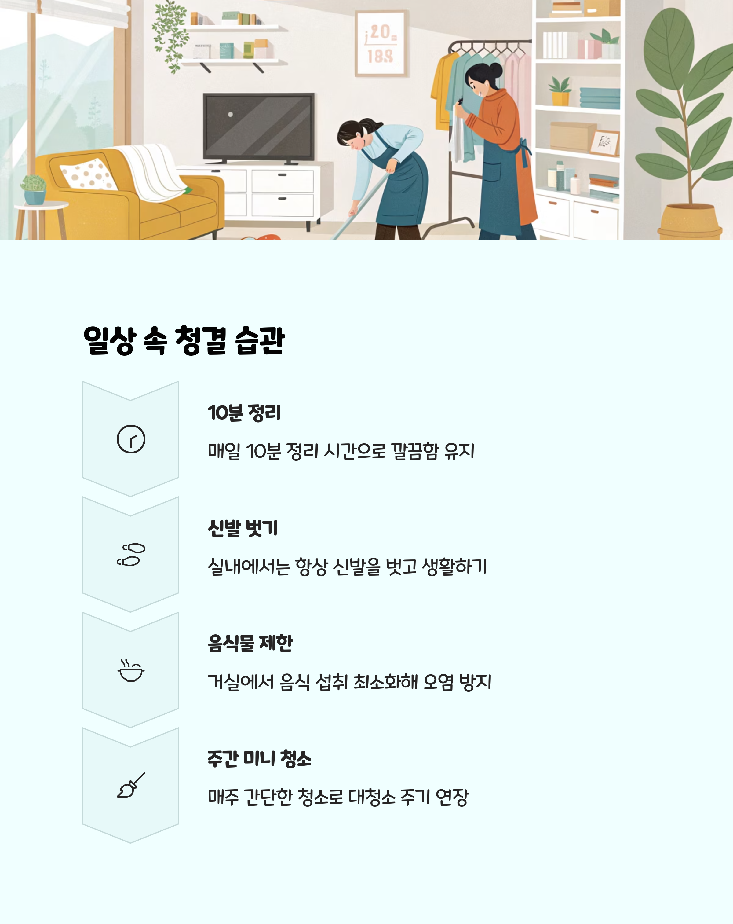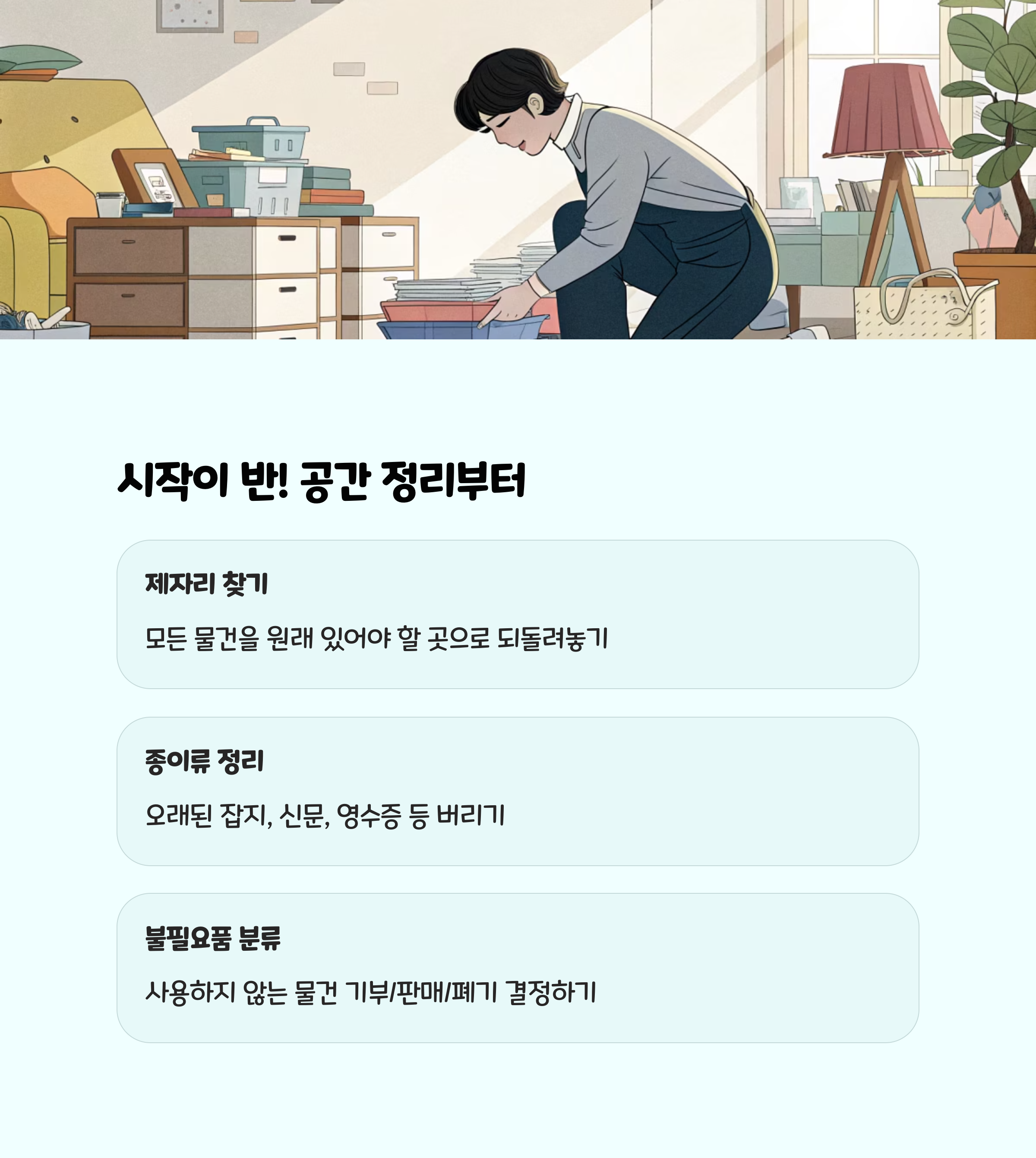 - 정리와 청소를 분리해서 진행하면 효율이 올라갑니다. 정리는 평소에, 청소는 주말에 집중적으로!