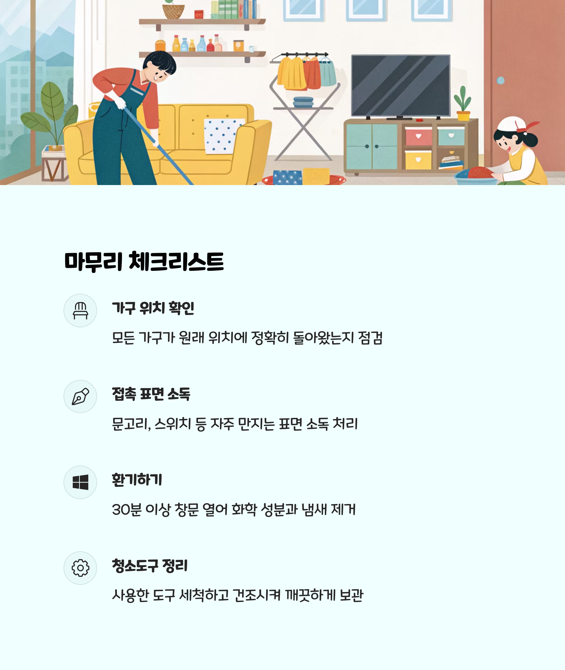 - 쓰레기통 비우기, 분리수거, 바닥에 남은 먼지 확인 등 마지막 점검을 해주세요.
