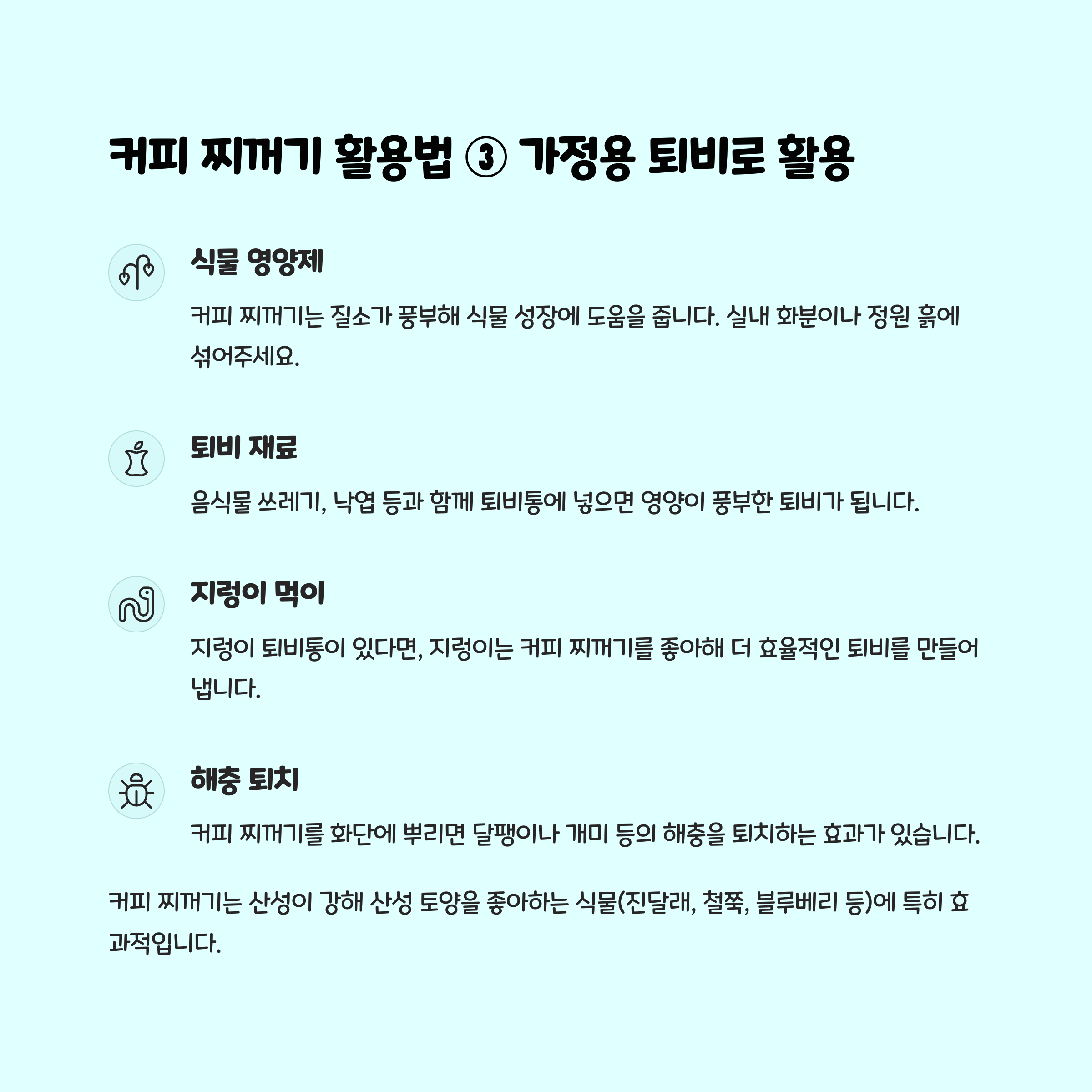 • 퇴비로 재활용 : 커피 찌꺼기를 퇴비로 사용하면 식물 성장에 필요한 영양소를 공급할 수 있습니다.