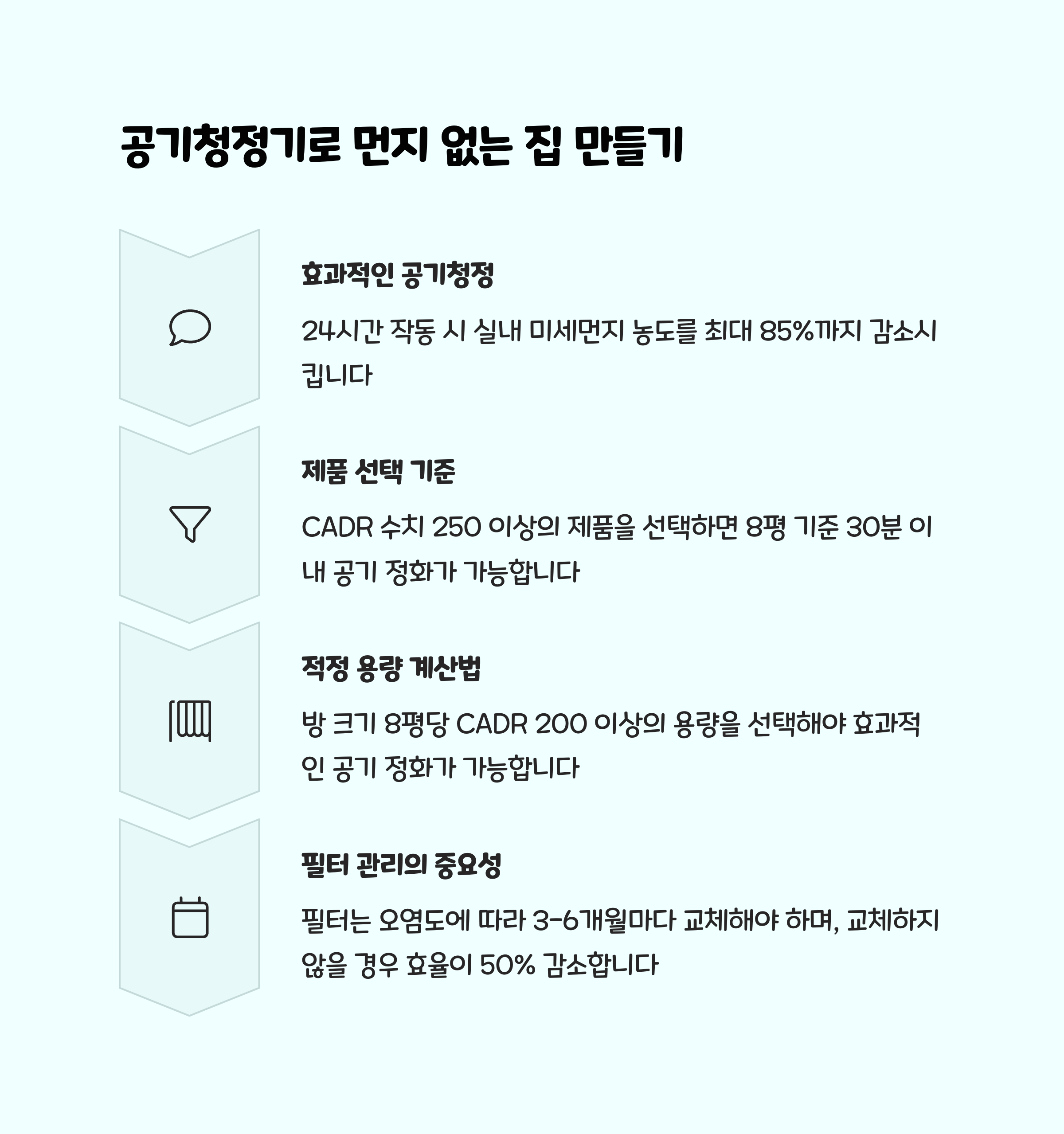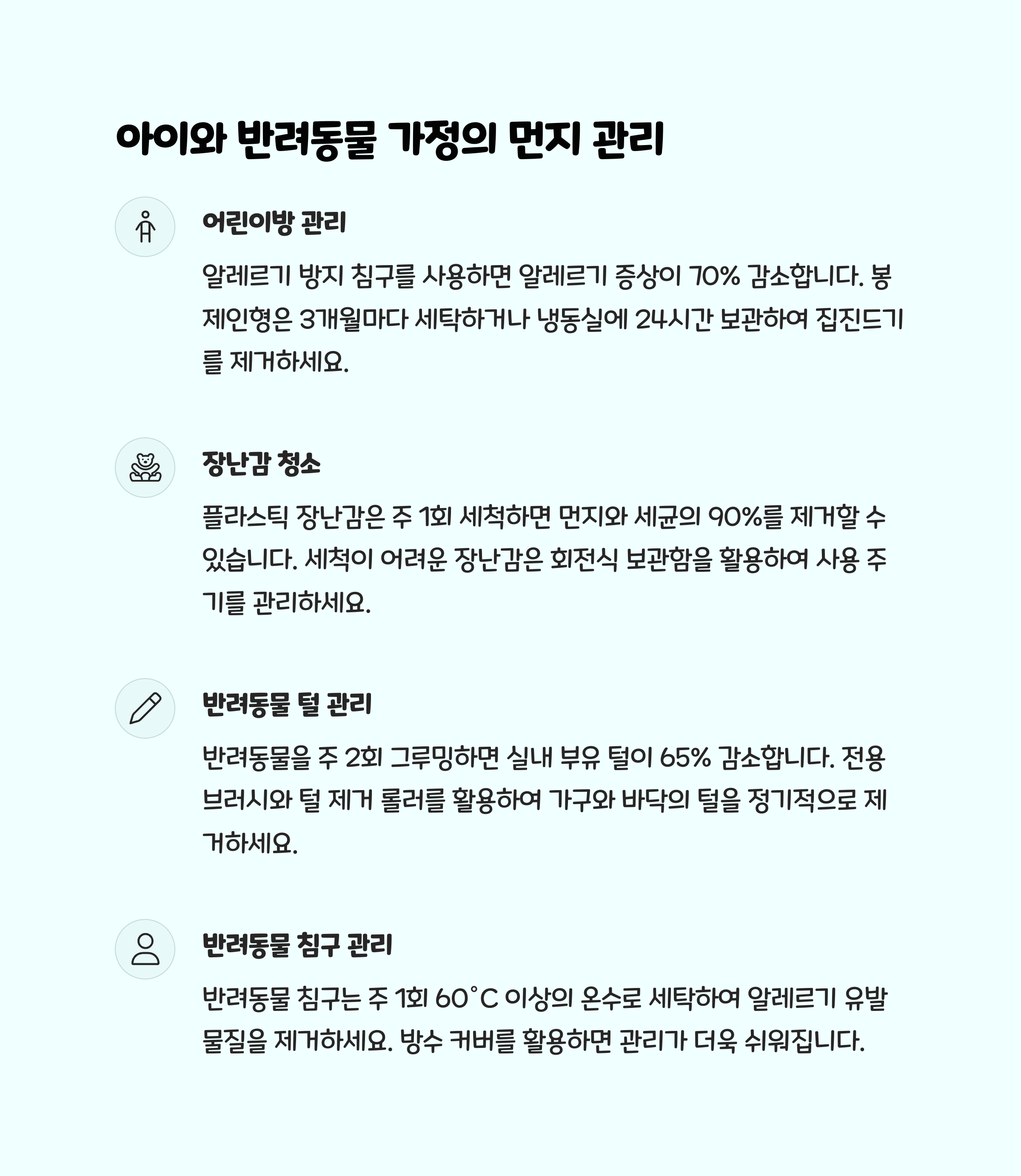 외부 유입 차단: 창문을 닫거나, 환기 시 미세먼지 농도가 낮은 시간대를 선택하세요. 문틈, 창문 틈새의 실링을 강화하면 외부 먼지 유입을 줄일 수 있습니다.섬유 제품 관리: 침구, 커튼, 카펫 등은 주기적으로 세탁하고, 가능한 한 직물 가구는 최소화하세요. 침구류는 일주일에 한 번 세탁하는 것이 좋습니다.정기적인 청소: 진공청소기는 HEPA 필터가 장착된 제품을 사용하면 집진드기와 미세먼지까지 효과적으로 제거할 수 있습니다. 청소 후에는 반드시 물걸레질로 마무리하세요.공기청정기 사용: HEPA 필터가 탑재된 공기청정기를 사용하면 공기 중의 미세먼지와 알레르기 유발 물질을 효과적으로 줄일 수 있습니다.습도 조절: 실내 습도를 45~50%로 유지하면 먼지가 가라앉고, 집진드기 번식을 억제할 수 있습니다.환기 시스템 관리: 중앙 환기 시스템이 있다면 필터를 주기적으로 교체하고, 청소 상태를 점검하세요.미니멀 인테리어: 불필요한 물건을 줄이고, 수납을 강화하면 먼지가 쌓일 공간 자체가 줄어듭니다.