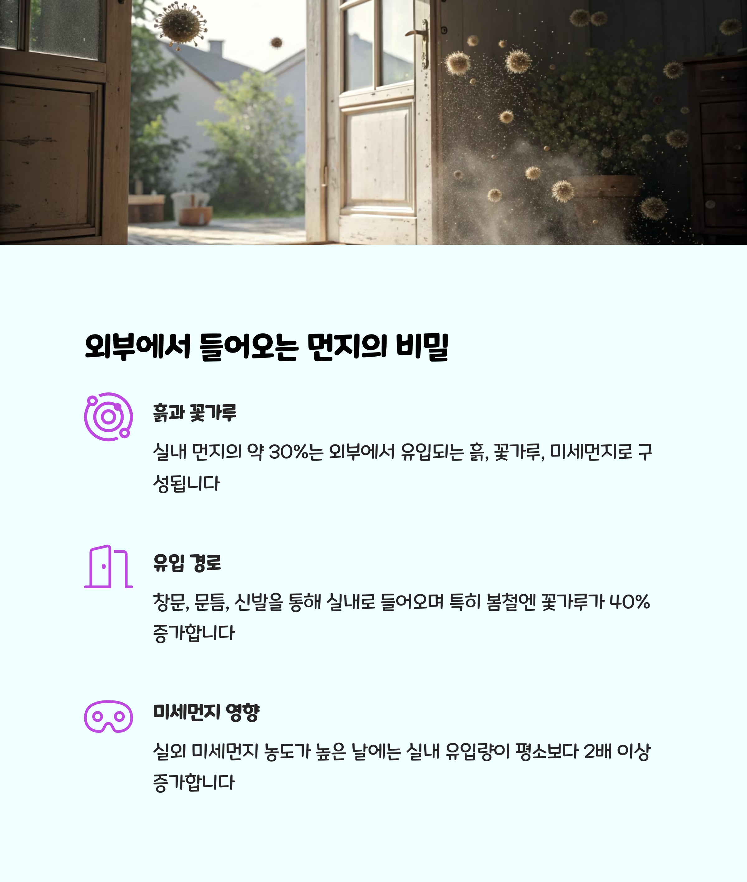 집안 먼지는 우리의 생활과 밀접하게 연결되어 있으며, 완전히 없앨 수는 없지만 충분히 관리할 수 있습니다. 침실과 직물 가구, 전자제품 주변 등 먼지가 집중적으로 쌓이는 공간을 중심으로, 주기적인 청소와 적절한 환기, 습도 관리, 그리고 공기청정기 활용을 통해 쾌적한 실내 환경을 유지할 수 있습니다.