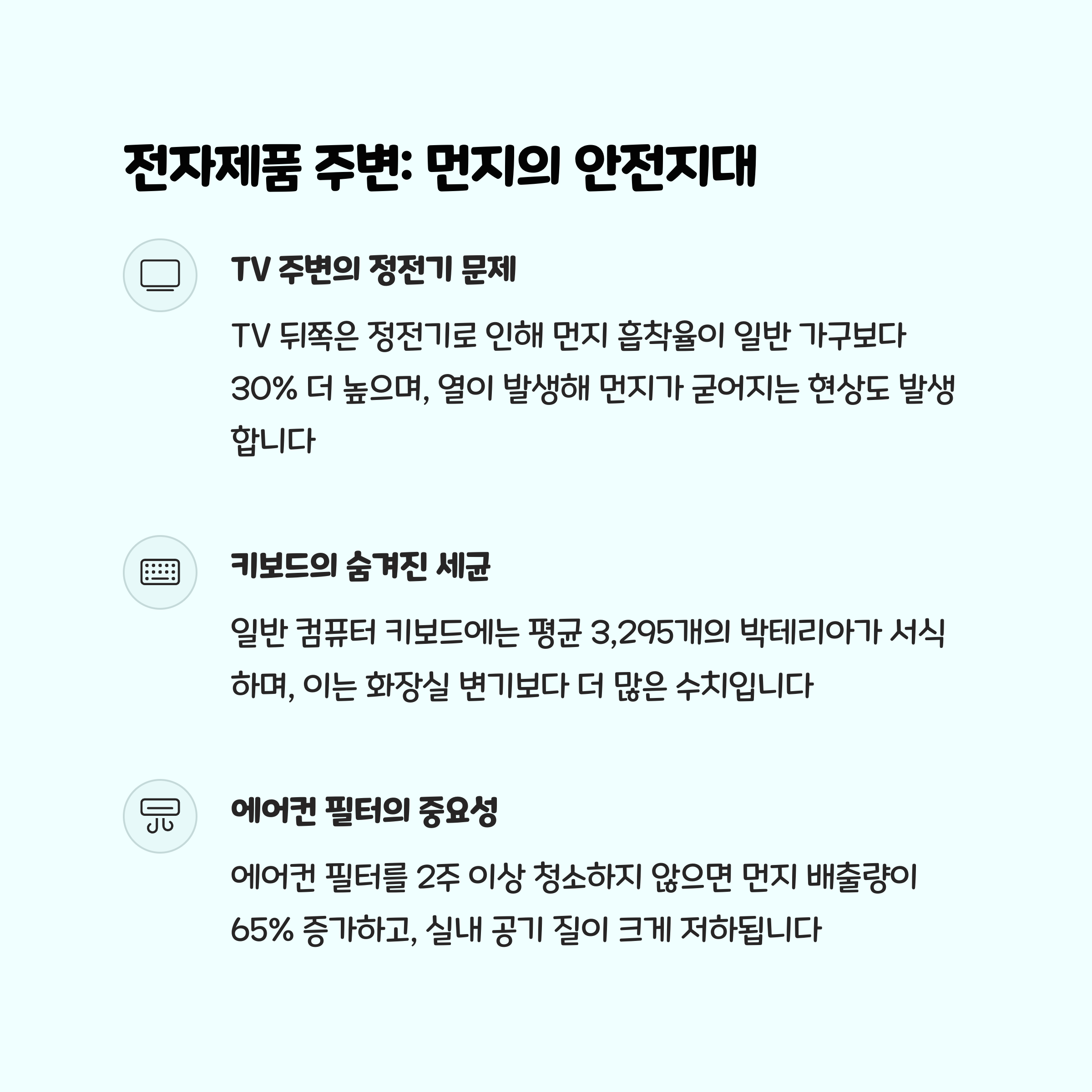 침실: 침구, 베개, 담요, 옷 등 섬유류가 많고, 하루 중 가장 오랜 시간을 보내는 공간입니다. 침구류에 집진드기와 각질, 섬유 부스러기가 집중적으로 쌓입니다. 침실은 집안에서 먼지가 가장 많이 발생하는 공간 중 하나입니다.소파, 카펫, 커튼 등 직물 가구: 소파와 카펫, 커튼은 먼지를 쉽게 모으고, 사용하면서 먼지가 공기 중으로 재비산 됩니다.전자제품 주변: TV, 컴퓨터, 오디오 등 전자제품은 정전기 때문에 먼지가 잘 달라붙습니다.가구 위, 선반, 냉장고 위: 평평하고 높은 표면은 청소가 소홀해지기 쉽고, 먼지가 쌓이기 좋습니다.창문, 문틈, 환기구: 외부 먼지가 유입되는 주요 통로입니다.가구 밑, 소파 틈새, 커튼 뒤: 청소가 어려운 사각지대에 먼지가 쉽게 모입니다.