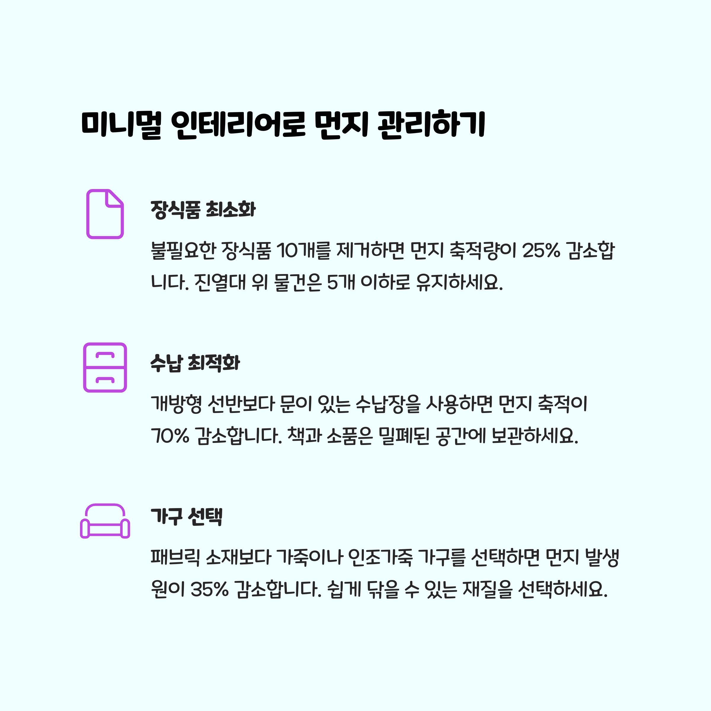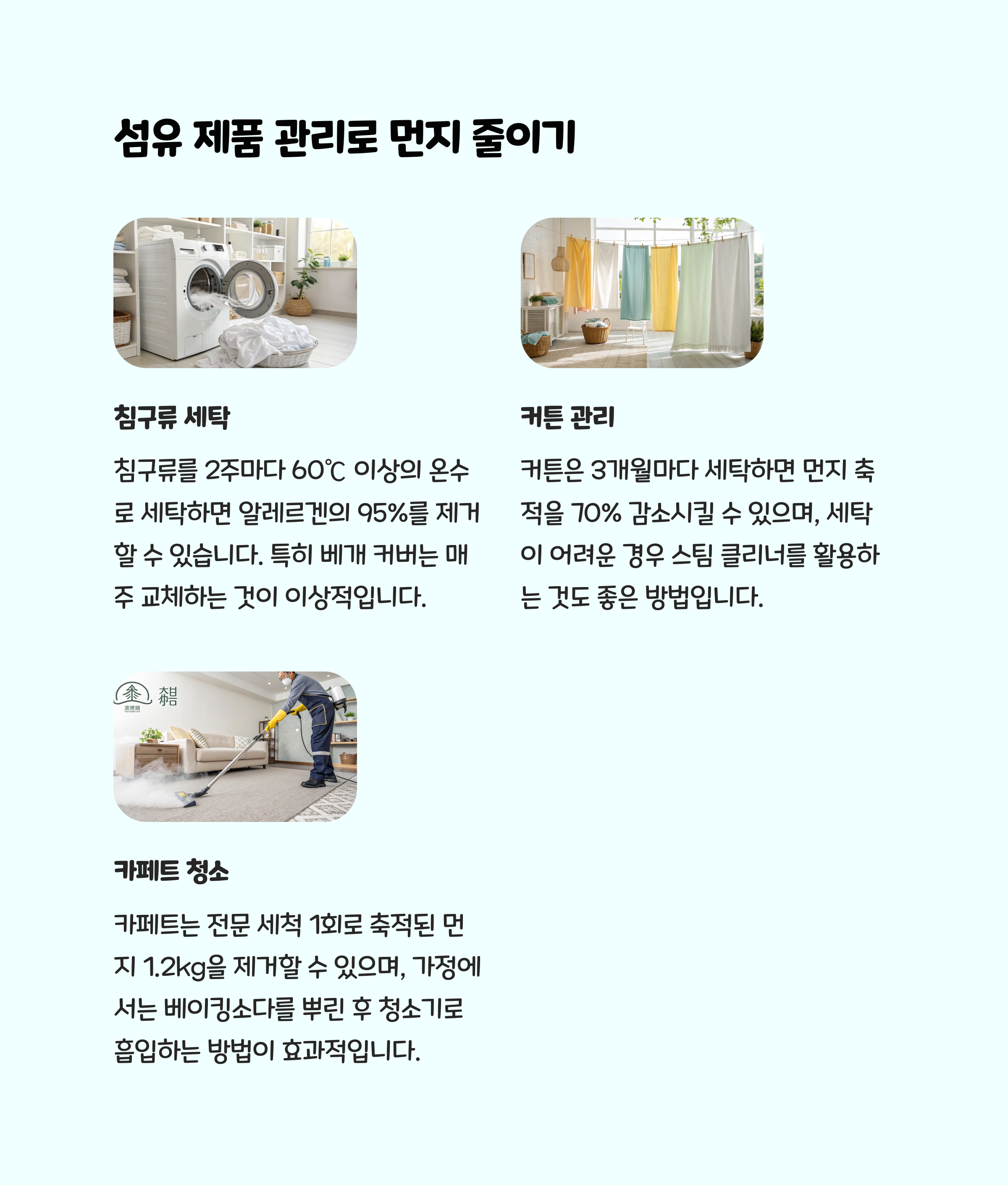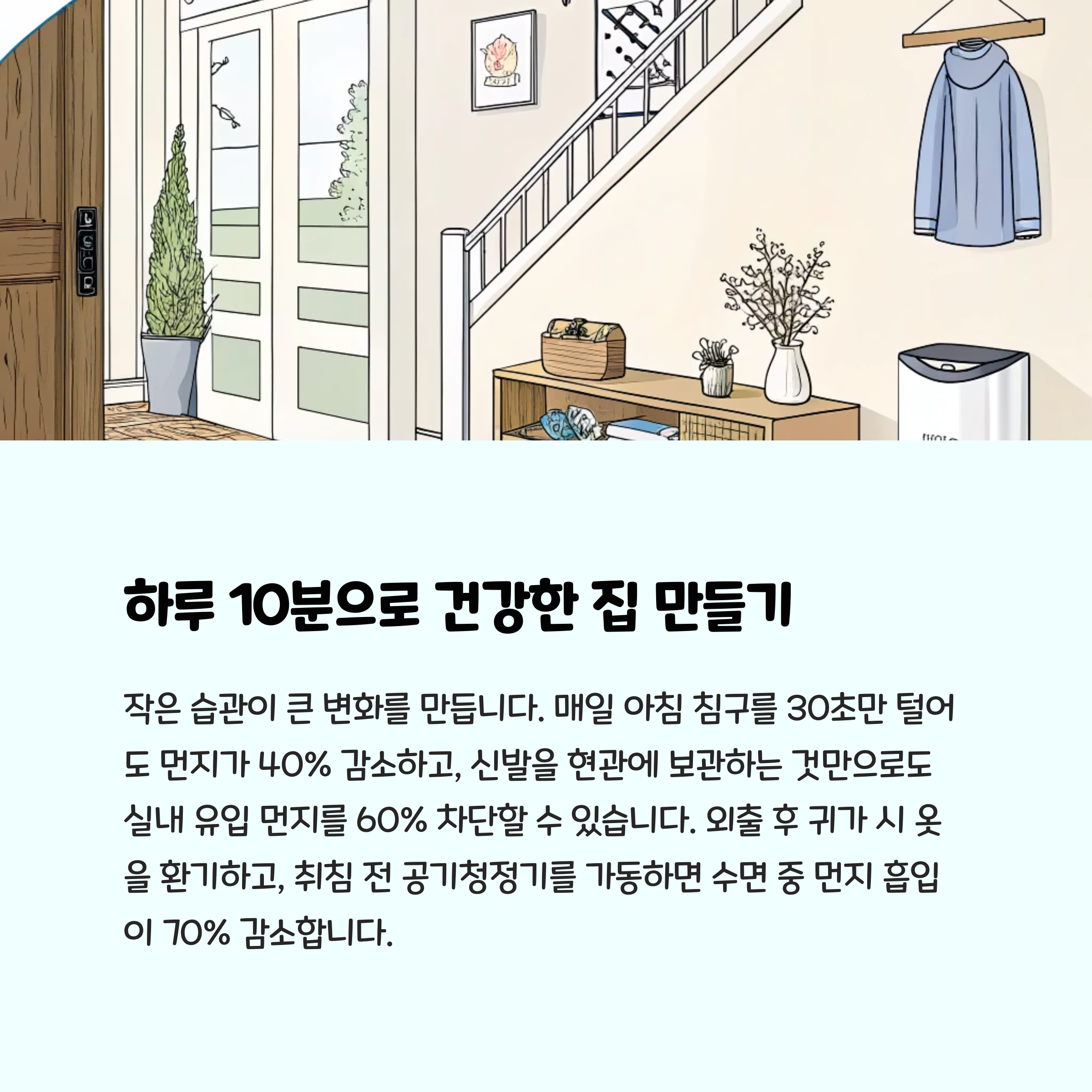 외부 유입 차단: 창문을 닫거나, 환기 시 미세먼지 농도가 낮은 시간대를 선택하세요. 문틈, 창문 틈새의 실링을 강화하면 외부 먼지 유입을 줄일 수 있습니다.섬유 제품 관리: 침구, 커튼, 카펫 등은 주기적으로 세탁하고, 가능한 한 직물 가구는 최소화하세요. 침구류는 일주일에 한 번 세탁하는 것이 좋습니다.정기적인 청소: 진공청소기는 HEPA 필터가 장착된 제품을 사용하면 집진드기와 미세먼지까지 효과적으로 제거할 수 있습니다. 청소 후에는 반드시 물걸레질로 마무리하세요.공기청정기 사용: HEPA 필터가 탑재된 공기청정기를 사용하면 공기 중의 미세먼지와 알레르기 유발 물질을 효과적으로 줄일 수 있습니다.습도 조절: 실내 습도를 45~50%로 유지하면 먼지가 가라앉고, 집진드기 번식을 억제할 수 있습니다.환기 시스템 관리: 중앙 환기 시스템이 있다면 필터를 주기적으로 교체하고, 청소 상태를 점검하세요.미니멀 인테리어: 불필요한 물건을 줄이고, 수납을 강화하면 먼지가 쌓일 공간 자체가 줄어듭니다.