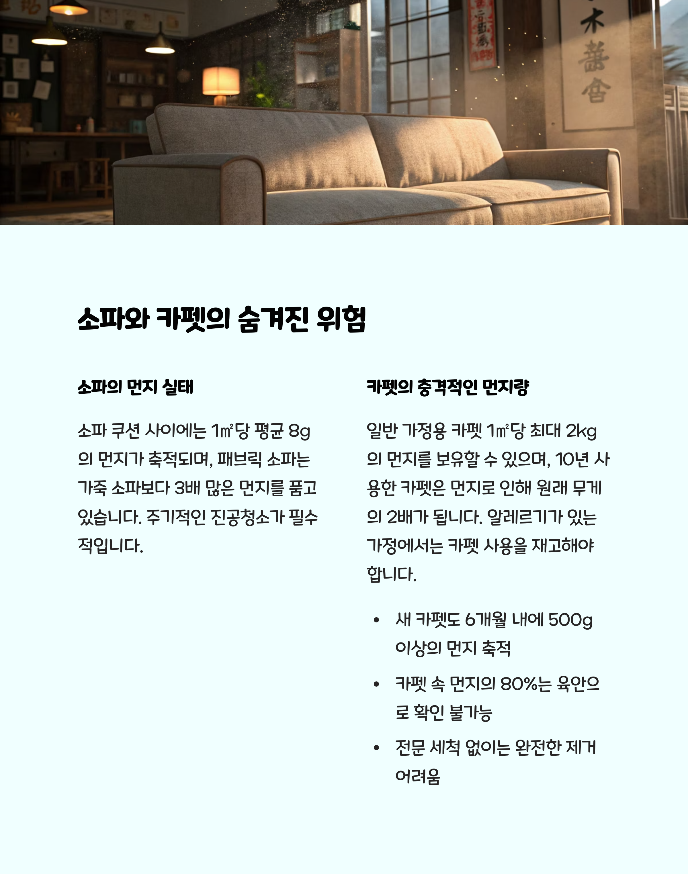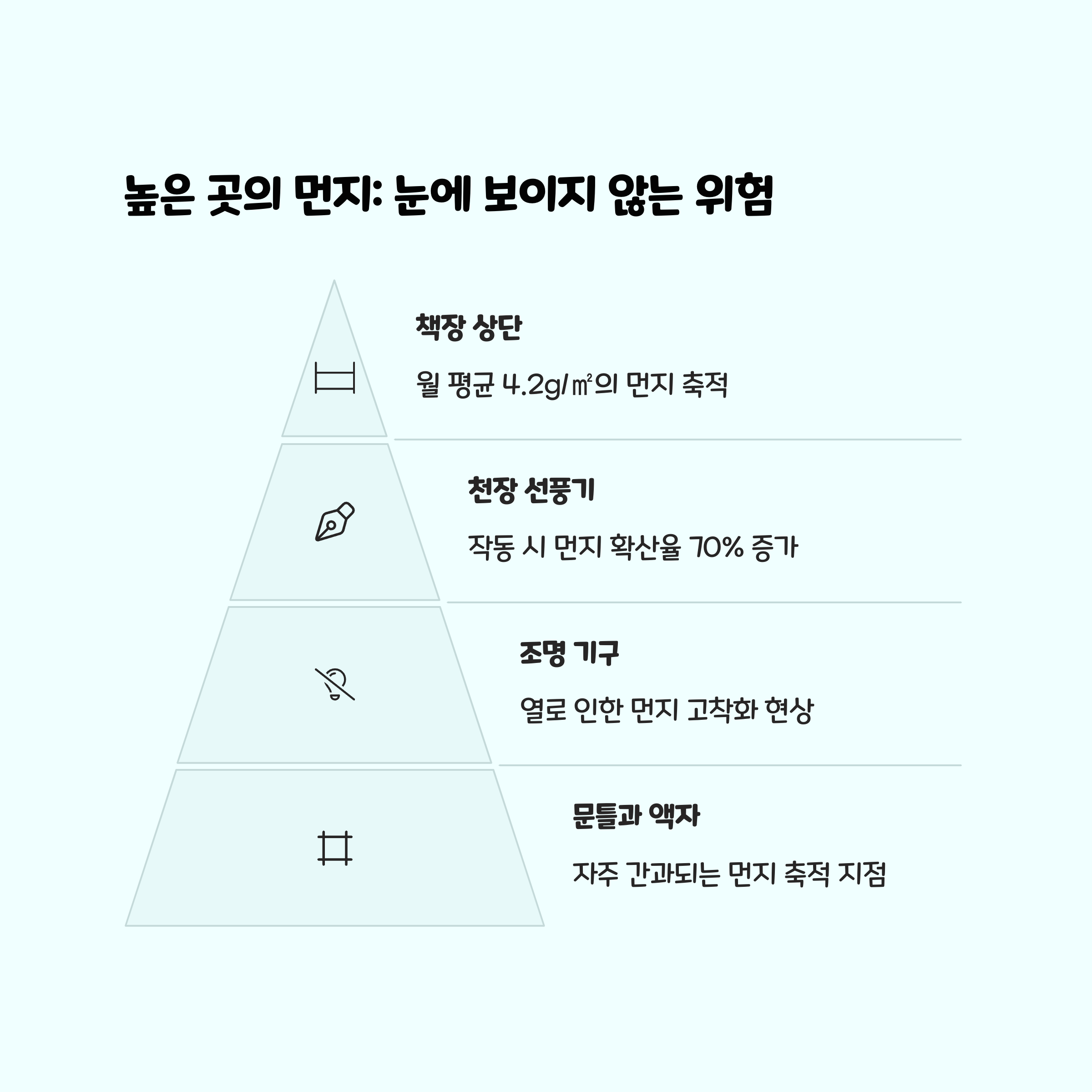침실: 침구, 베개, 담요, 옷 등 섬유류가 많고, 하루 중 가장 오랜 시간을 보내는 공간입니다. 침구류에 집진드기와 각질, 섬유 부스러기가 집중적으로 쌓입니다. 침실은 집안에서 먼지가 가장 많이 발생하는 공간 중 하나입니다.소파, 카펫, 커튼 등 직물 가구: 소파와 카펫, 커튼은 먼지를 쉽게 모으고, 사용하면서 먼지가 공기 중으로 재비산 됩니다.전자제품 주변: TV, 컴퓨터, 오디오 등 전자제품은 정전기 때문에 먼지가 잘 달라붙습니다.가구 위, 선반, 냉장고 위: 평평하고 높은 표면은 청소가 소홀해지기 쉽고, 먼지가 쌓이기 좋습니다.창문, 문틈, 환기구: 외부 먼지가 유입되는 주요 통로입니다.가구 밑, 소파 틈새, 커튼 뒤: 청소가 어려운 사각지대에 먼지가 쉽게 모입니다.