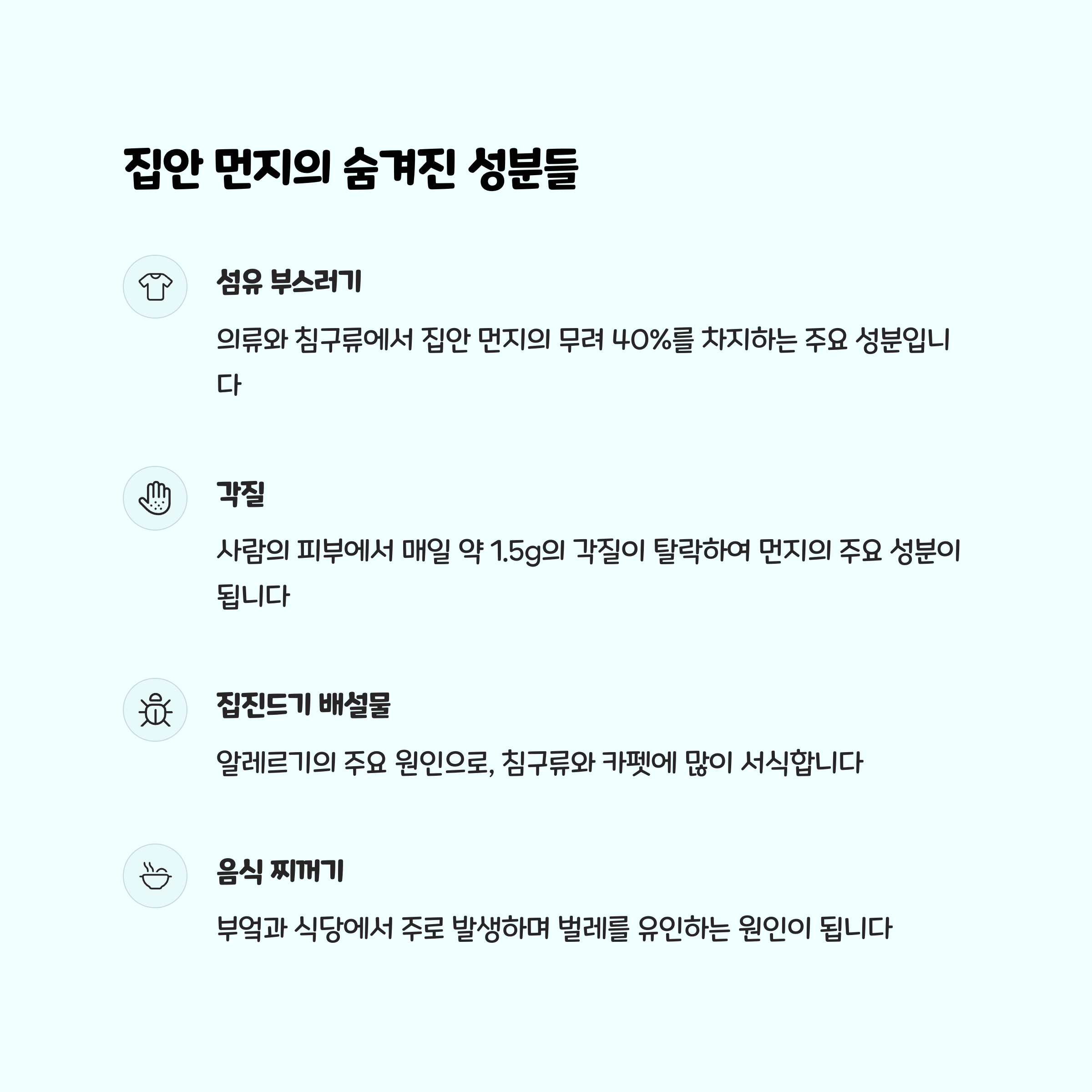 섬유 부스러기: 옷, 이불, 커튼, 카펫 등에서 떨어지는 미세한 섬유 조각이 먼지의 큰 부분을 차지합니다.각질과 머리카락: 사람과 반려동물의 피부 각질, 머리카락, 비듬 등이 일상적으로 떨어지면서 먼지를 만듭니다.집진드기 배설물: 집진드기는 주로 침구류, 카펫, 소파 등 섬유 제품에 서식하며, 이들의 배설물은 알레르기 유발의 주요 원인이기도 합니다. 집진드기 한 마리는 3개월 동안 자신의 체중의 200배에 달하는 배설물을 만들어냅니다.음식 부스러기와 곤충 사체: 식사 후 남은 음식 찌꺼기, 죽은 곤충의 잔해 등도 먼지의 일부가 됩니다.외부 유입: 창문, 문틈, 벽의 균열 등을 통해 미세먼지, 흙먼지 등이 실내로 들어옵니다. 특히 도로변이나 공사장 근처에 위치한 집은 외부 먼지 유입이 더 많습니다.