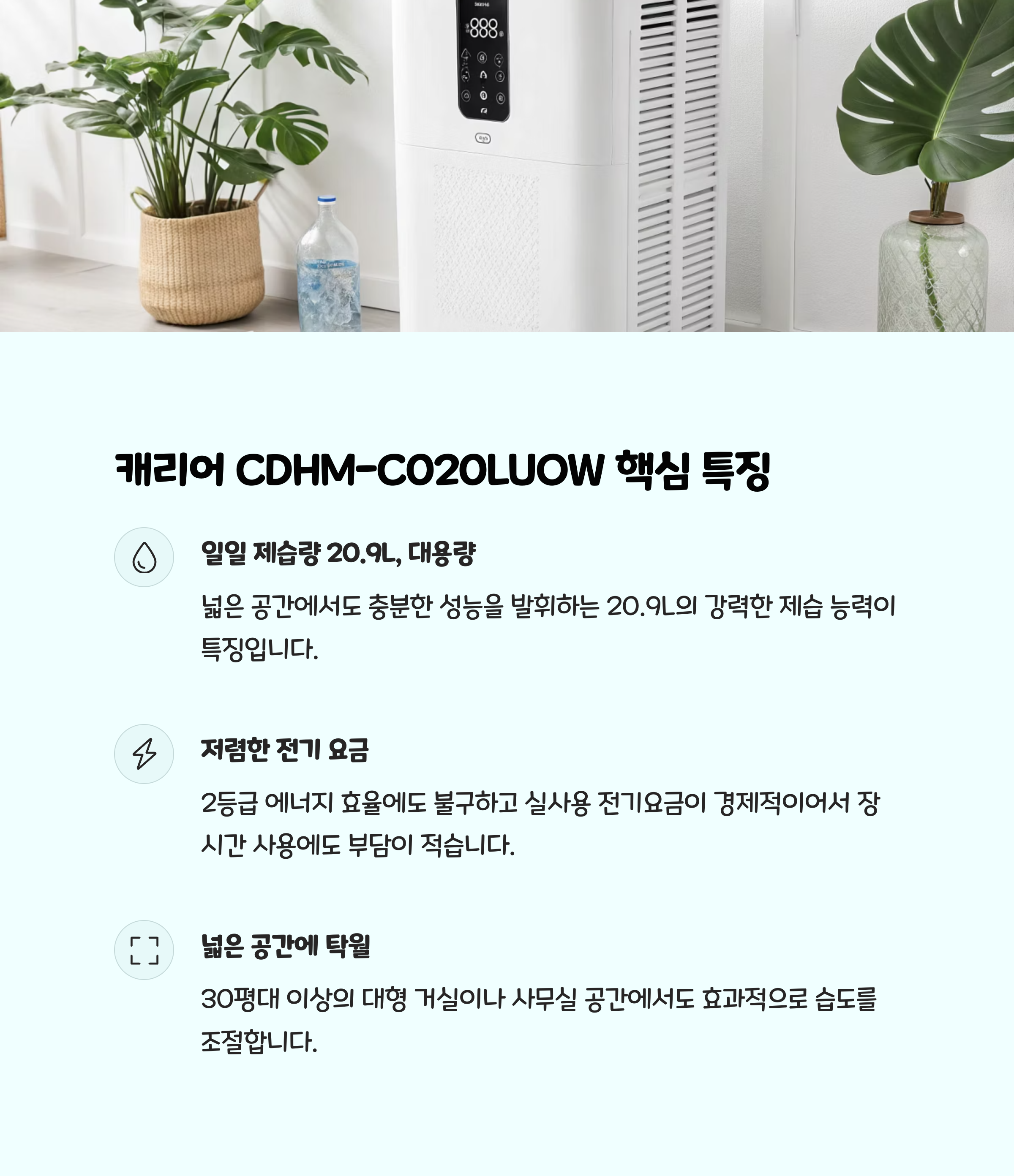 - 초고효율 제습 : 일일 20.9L 처리로 대형 공간(25평↑) 적합