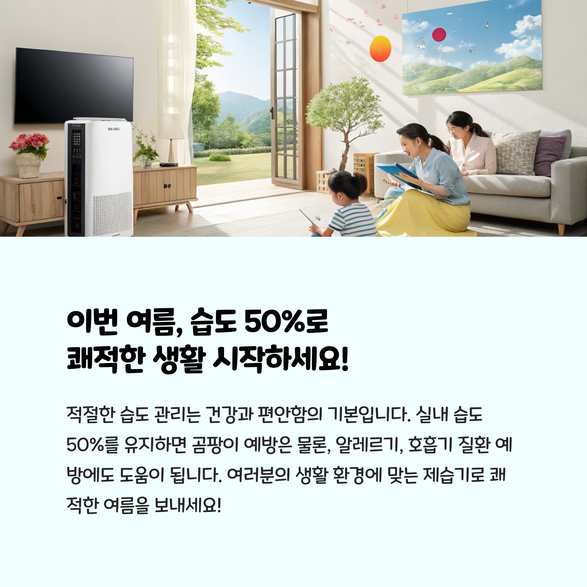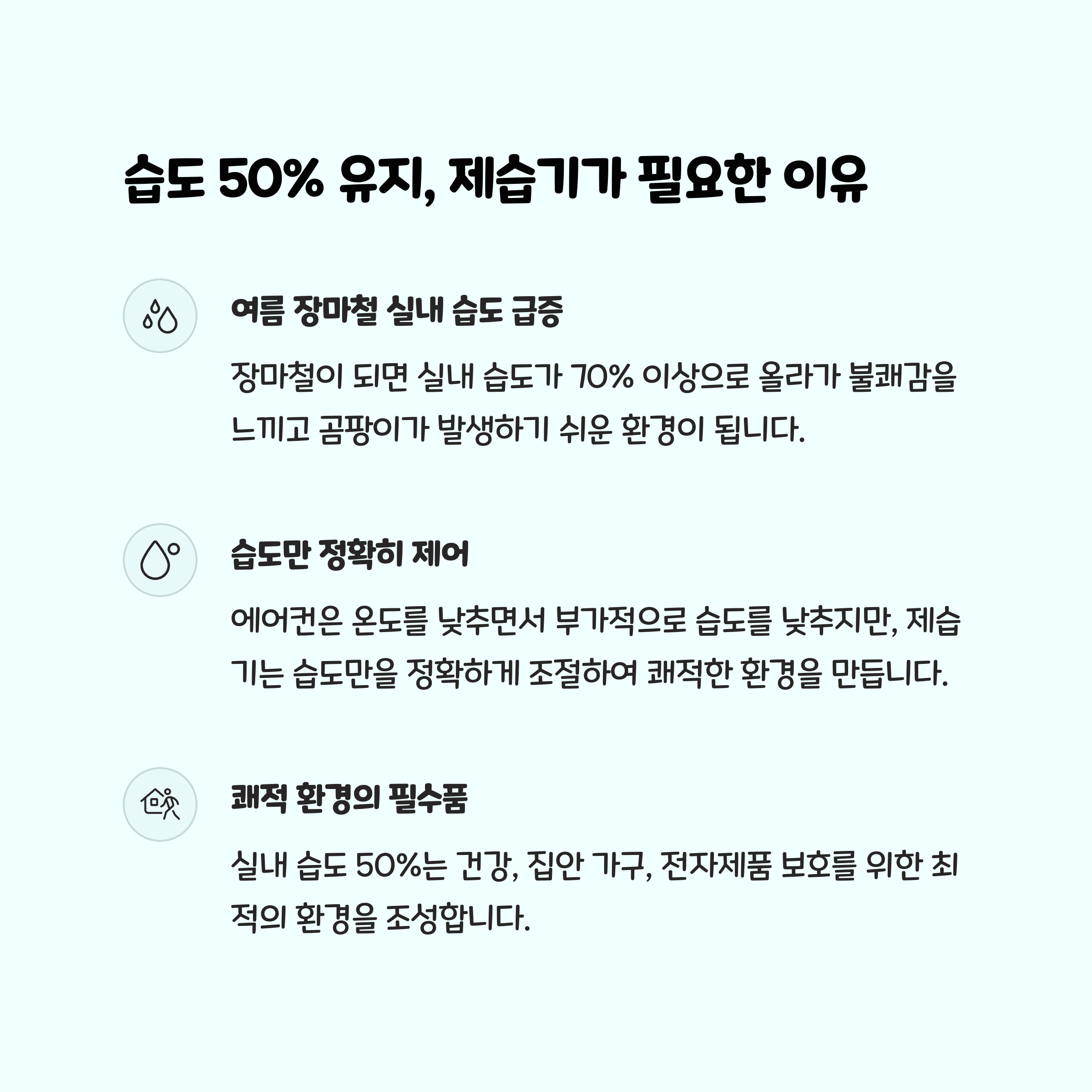 실내 습도가 60% 이상이면 곰팡이, 집먼지진드기 등 유해 미생물이 빠르게 번식해 건강에 악영향을 줄 수 있습니다. 제습기는 습도를 50% 내외로 유지해 쾌적한 환경을 만들고, 벽지 손상, 가구 변형, 전자제품 고장 등도 예방할 수 있습니다.