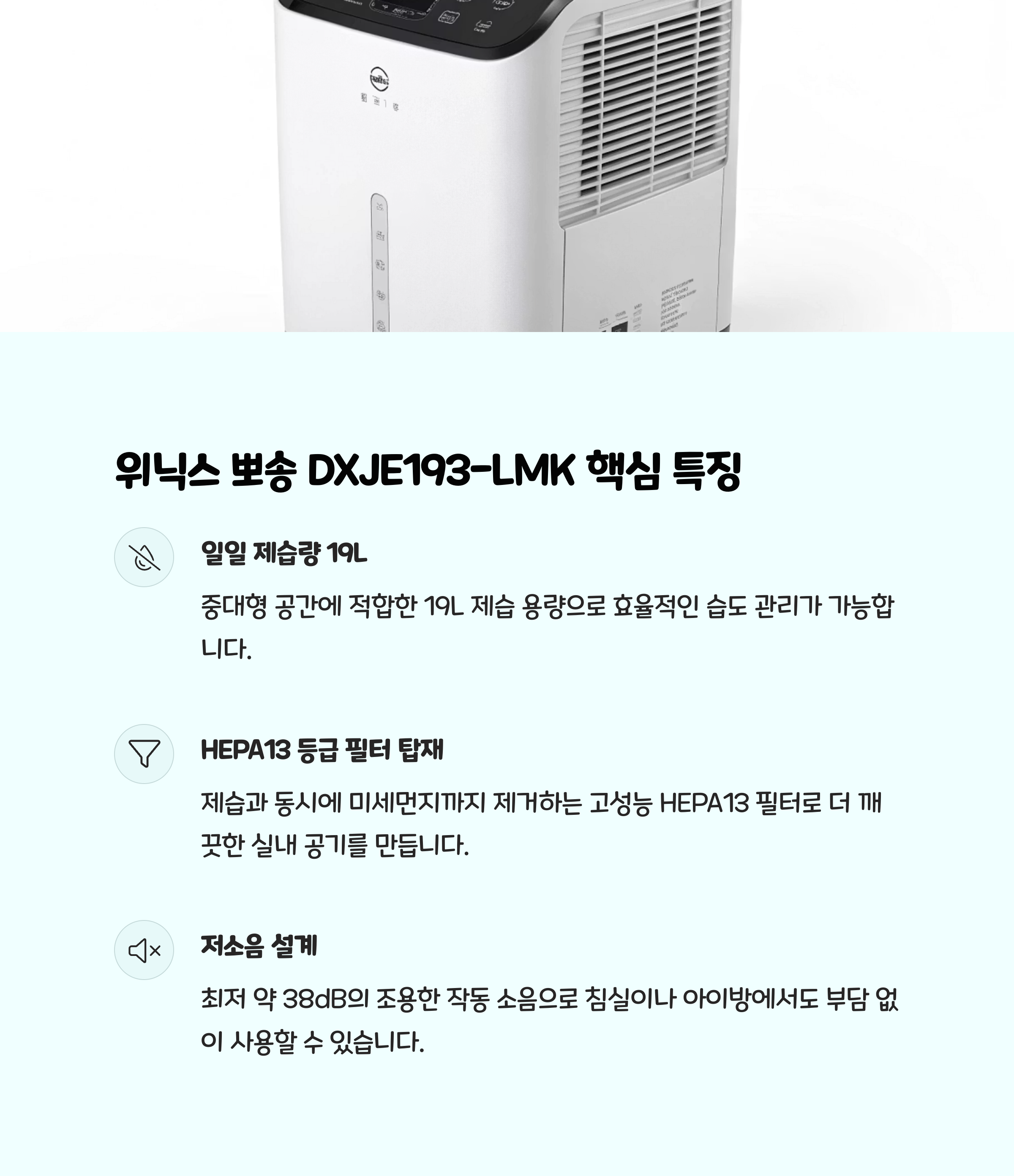 - 소음 대비 성능 : 50dB 환경에서 12.5L/일 처리능력