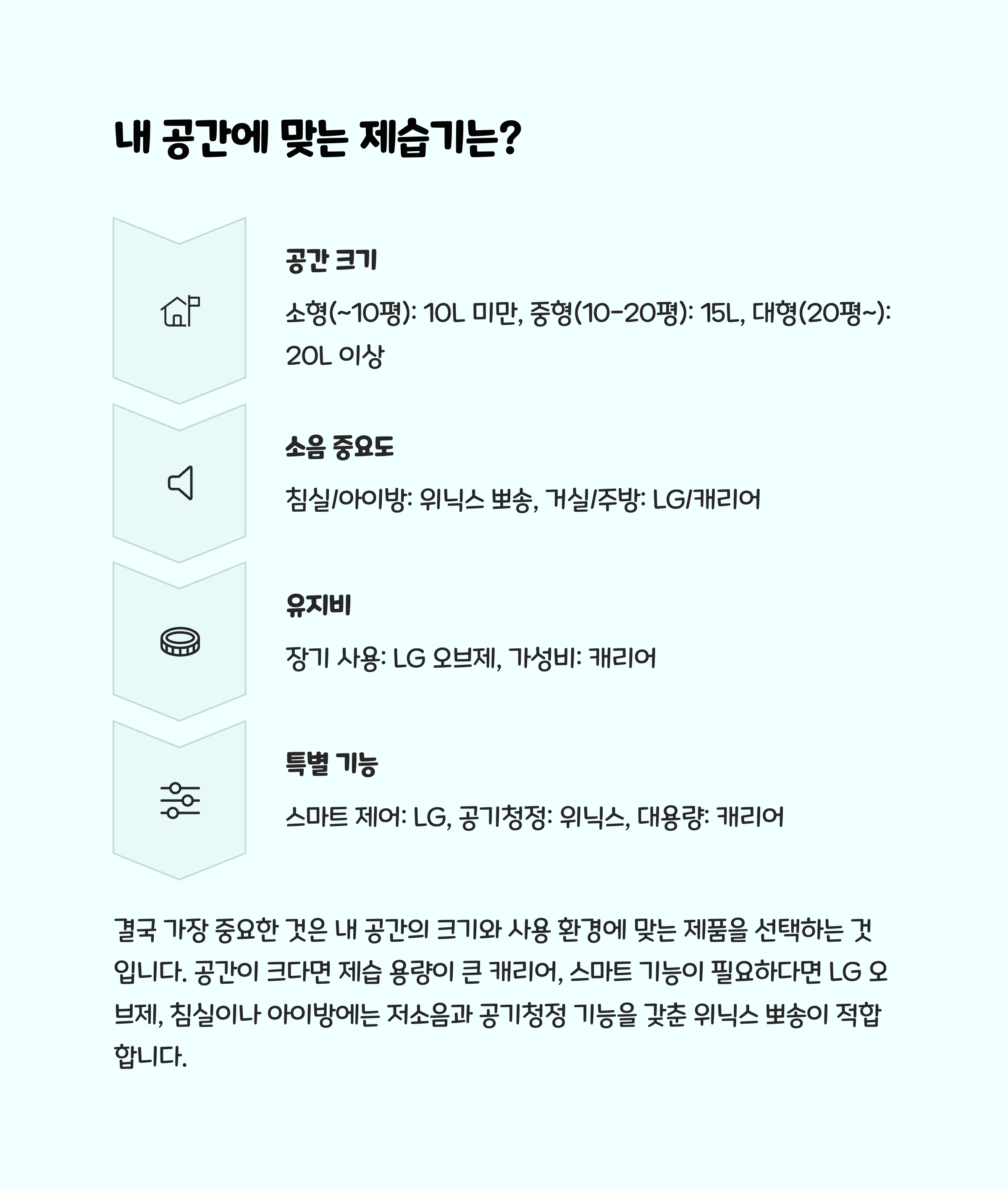 20평 이상 대형 주택에서는 캐리어 모델이 압도적인 제습량으로 효율적입니다. 반면 소음 민감도가 높은 아기방에는 위닉스 제품이 49dB의 저소음 특성을 보여주며, 스마트홈 연동을 원한다면 LG 모델이 최적입니다.
