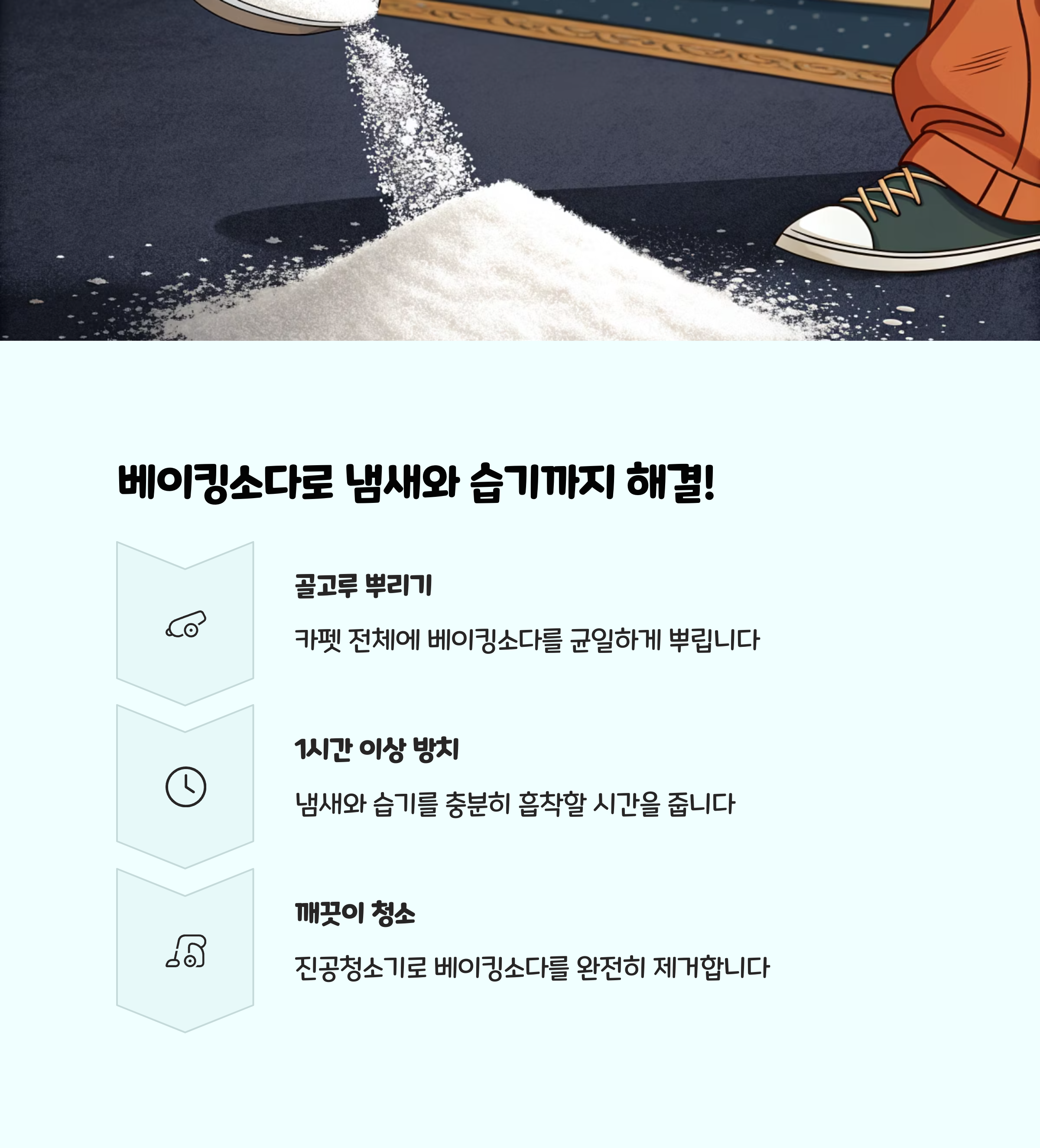 베이킹소다는 냄새 분자와 수분을 흡착하는 효과가 탁월합니다. 카펫 전체에 골고루 뿌린 후, 최소 20~30분에서 최대 1시간 이상(심한 냄새는 하룻밤) 방치합니다. 이후 진공청소기로 베이킹소다를 빨아들이면 퀴퀴한 냄새와 습기, 일부 오염까지 깔끔하게 제거할 수 있습니다.
