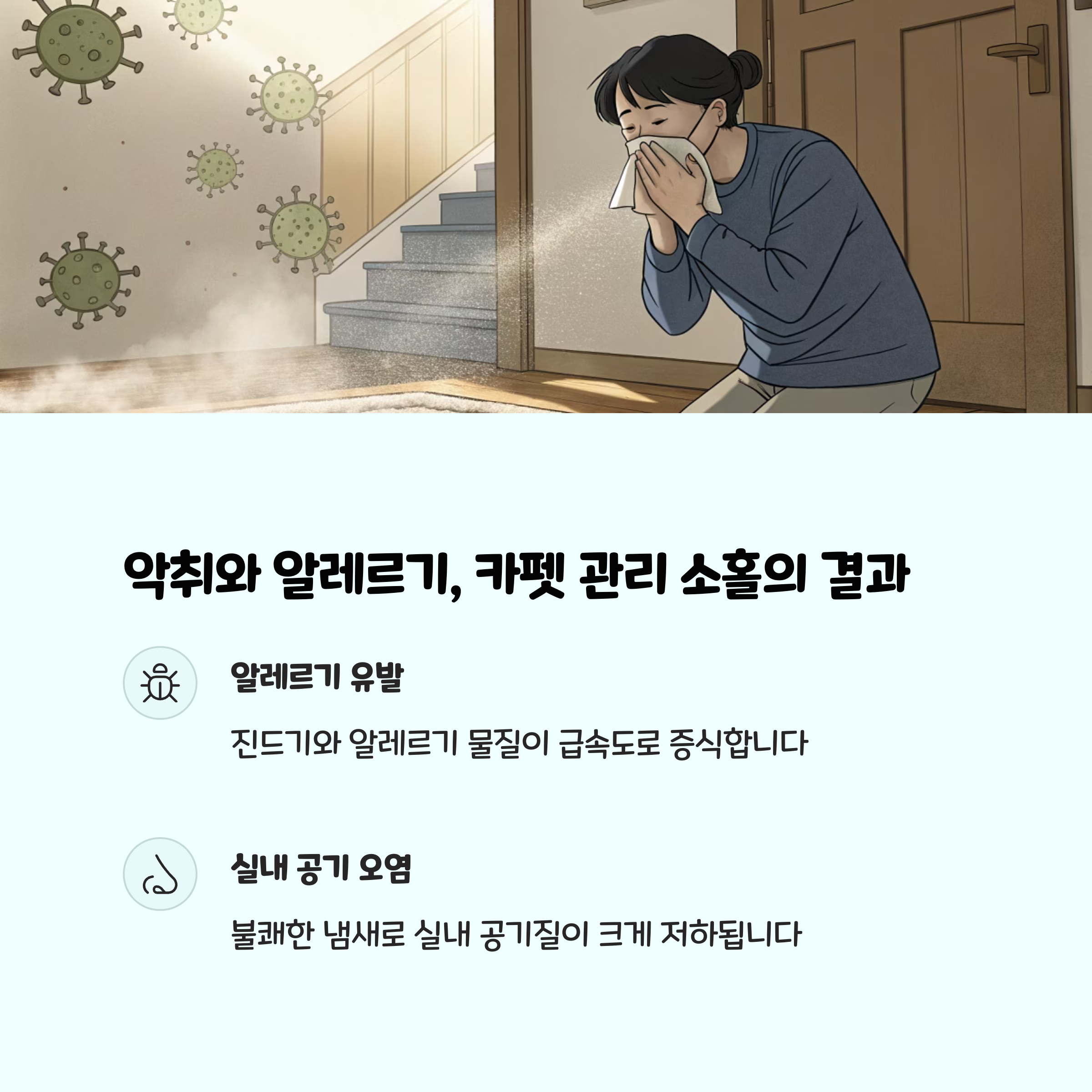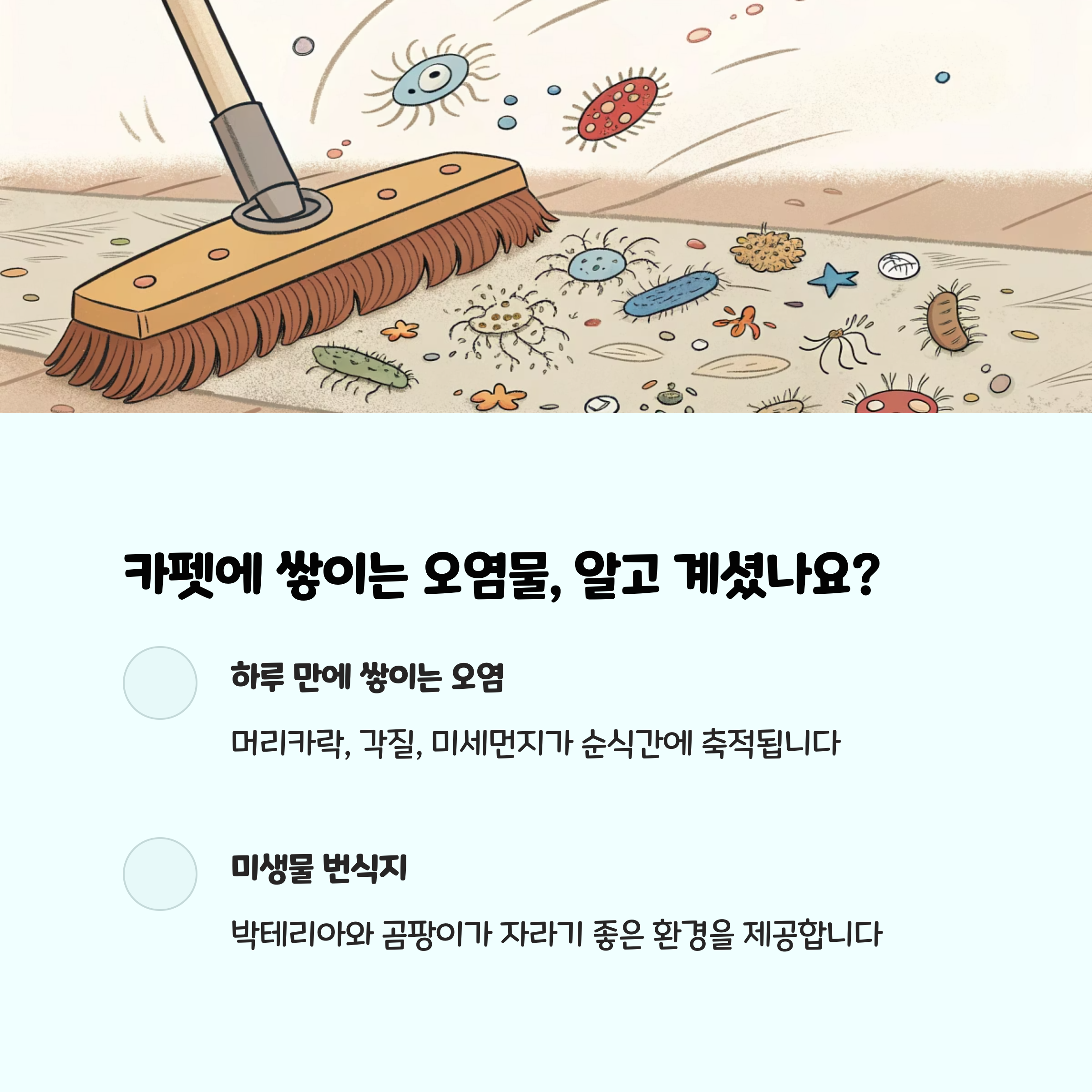 카펫은 집안의 먼지, 머리카락, 음식물, 각종 오염물질이 쉽게 쌓이는 공간입니다. 주기적으로 청소하지 않으면 세균 번식, 악취, 알레르기 유발 등 건강에도 영향을 줄 수 있습니다. 실제로 카펫 1제곱미터에는 최대 10만 마리 이상의 먼지 진드기가 서식할 수 있다는 연구 결과도 있습니다. 그렇기 때문에 정기적인 셀프 청소는 쾌적한 실내 환경을 위해 꼭 필요합니다.