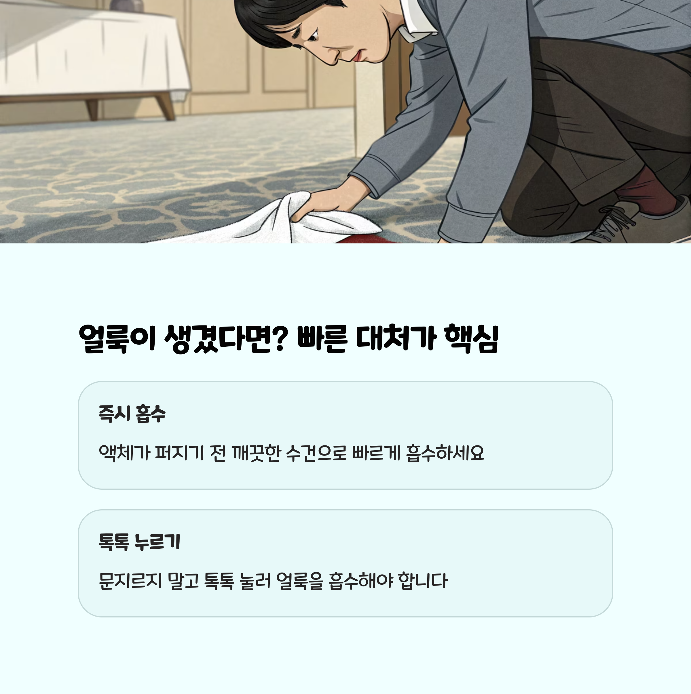 - 마른 천이나 키친타월로 최대한 빠르게 흡수합니다.