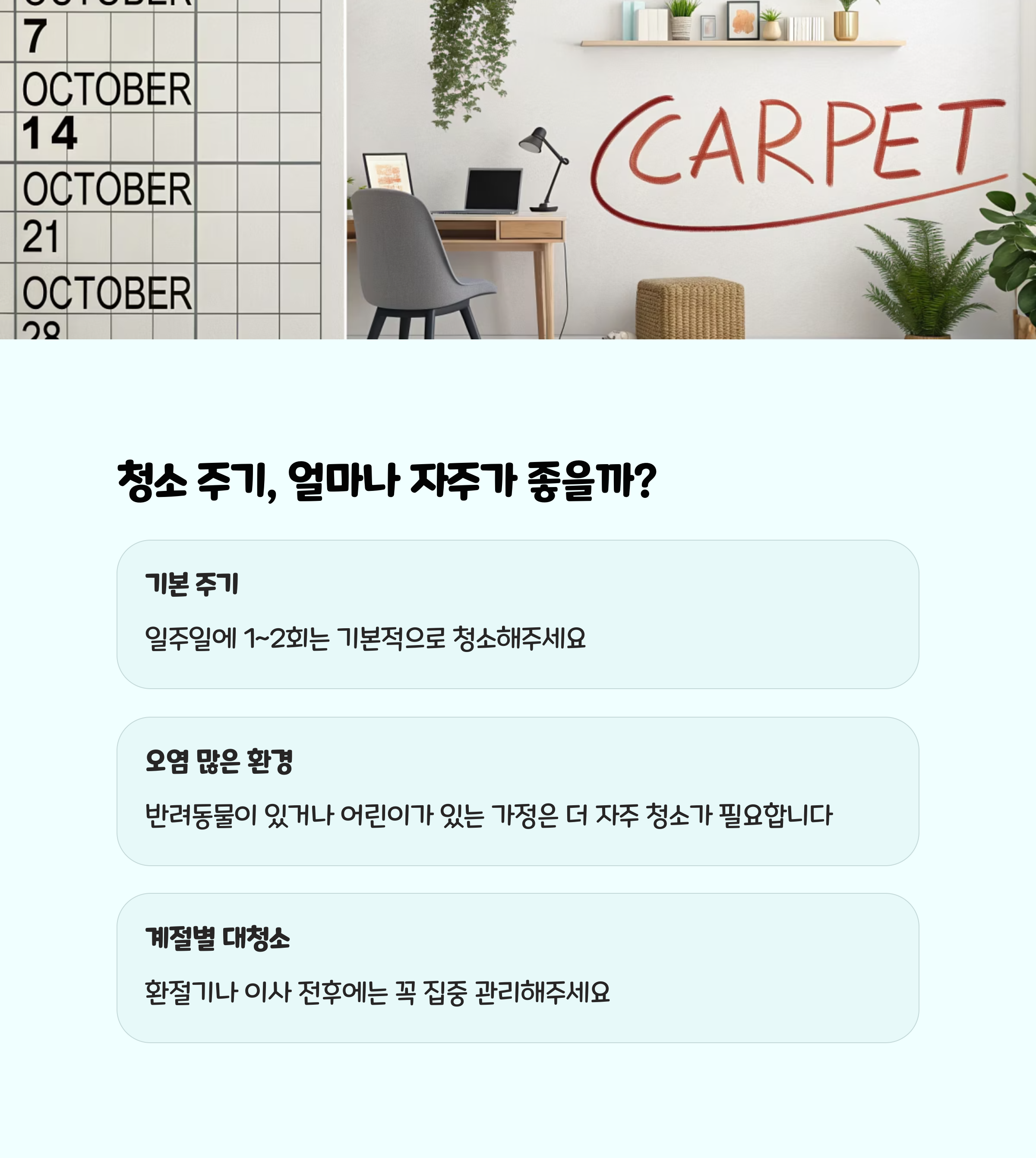 주 1~2회 진공청소기로 카펫을 청소해 먼지와 오염물질을 미리 제거하세요.월 1회 베이킹소다 청소로 냄새와 습기를 잡아줍니다.- 오염이 심한 부분은 즉시 위의 얼룩 제거법을 적용해 관리하면, 카펫의 수명을 2배 이상 늘릴 수 있습니다.