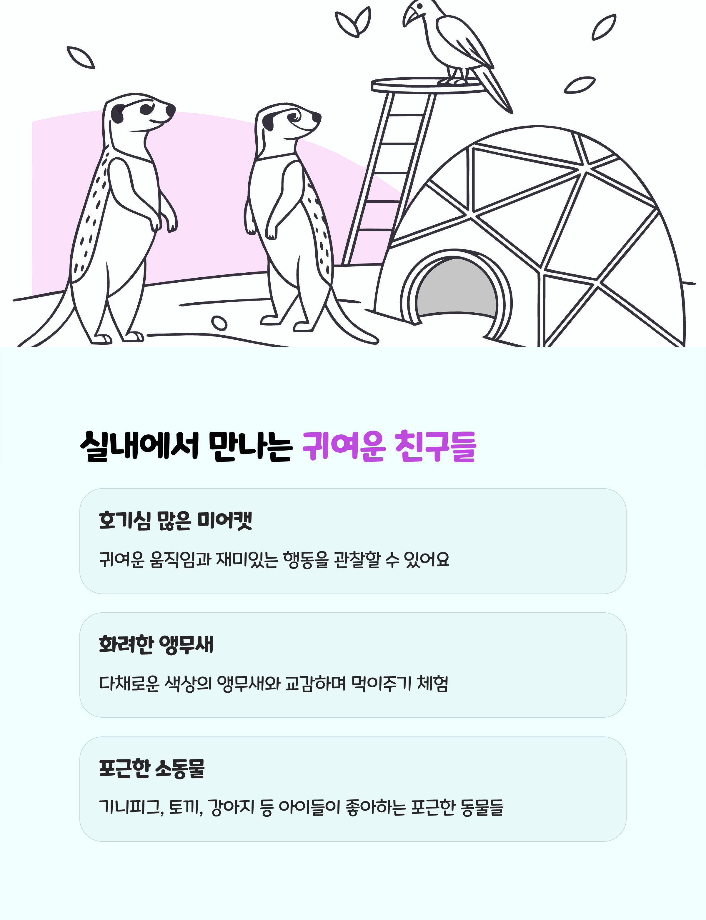 • 조랑말・말: 실내에서 안전하게 관찰 가능하며 이벤트 시 산책 체험도 제공.