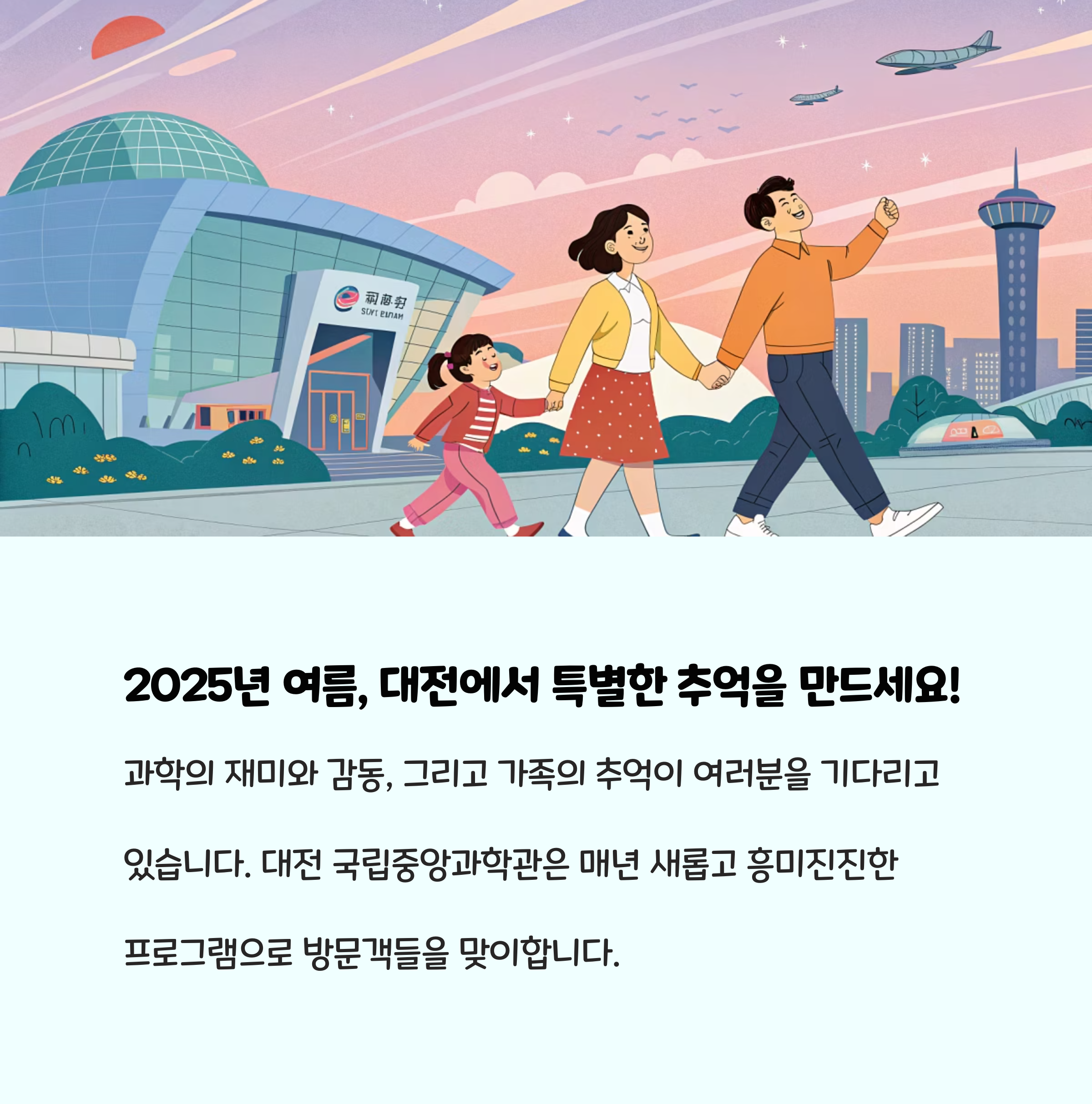 대전의 과학관·박물관 체험 여행은 단순한 나들이가 아니라, 아이의 미래를 키우는 소중한 경험입니다. 직접 보고 만지는 전시, 다양한 실험 프로그램, 계절마다 달라지는 특별 행사까지—가족 모두가 만족할 수밖에 없는 이유가 있습니다. 2025년 여름, 아이와 함께 대전에서 특별한 하루를 만들어보세요. 과학의 재미와 감동, 그리고 가족의 추억이 여러분을 기다리고 있습니다!