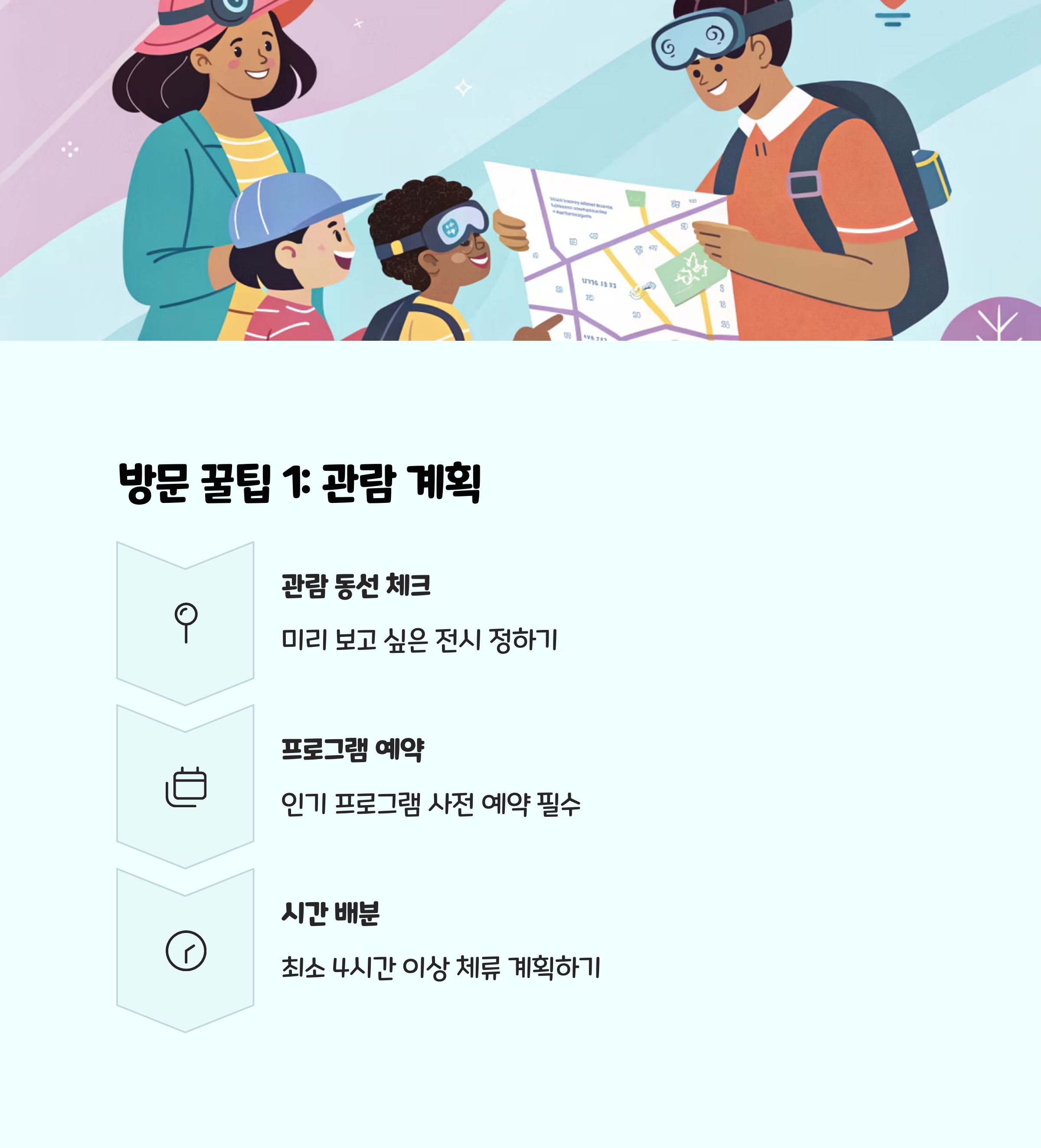 관람 동선 미리 체크: 전시관이 넓으니, 미리 보고 싶은 전시와 체험 프로그램을 정해두면 시간 효율이 높아집니다.체험 프로그램 사전 예약: 인기 프로그램은 조기 마감되니, 공식 홈페이지에서 미리 예약하세요.주차 및 교통: KTX 대전역에서 버스·택시로 20분 내외, 자차 이용 시 주차장 넓고 쾌적합니다.체험학습 보고서 활용: 초등학생의 경우, 체험학습 보고서로 제출하면 학교에서도 좋은 반응을 얻을 수 있습니다.