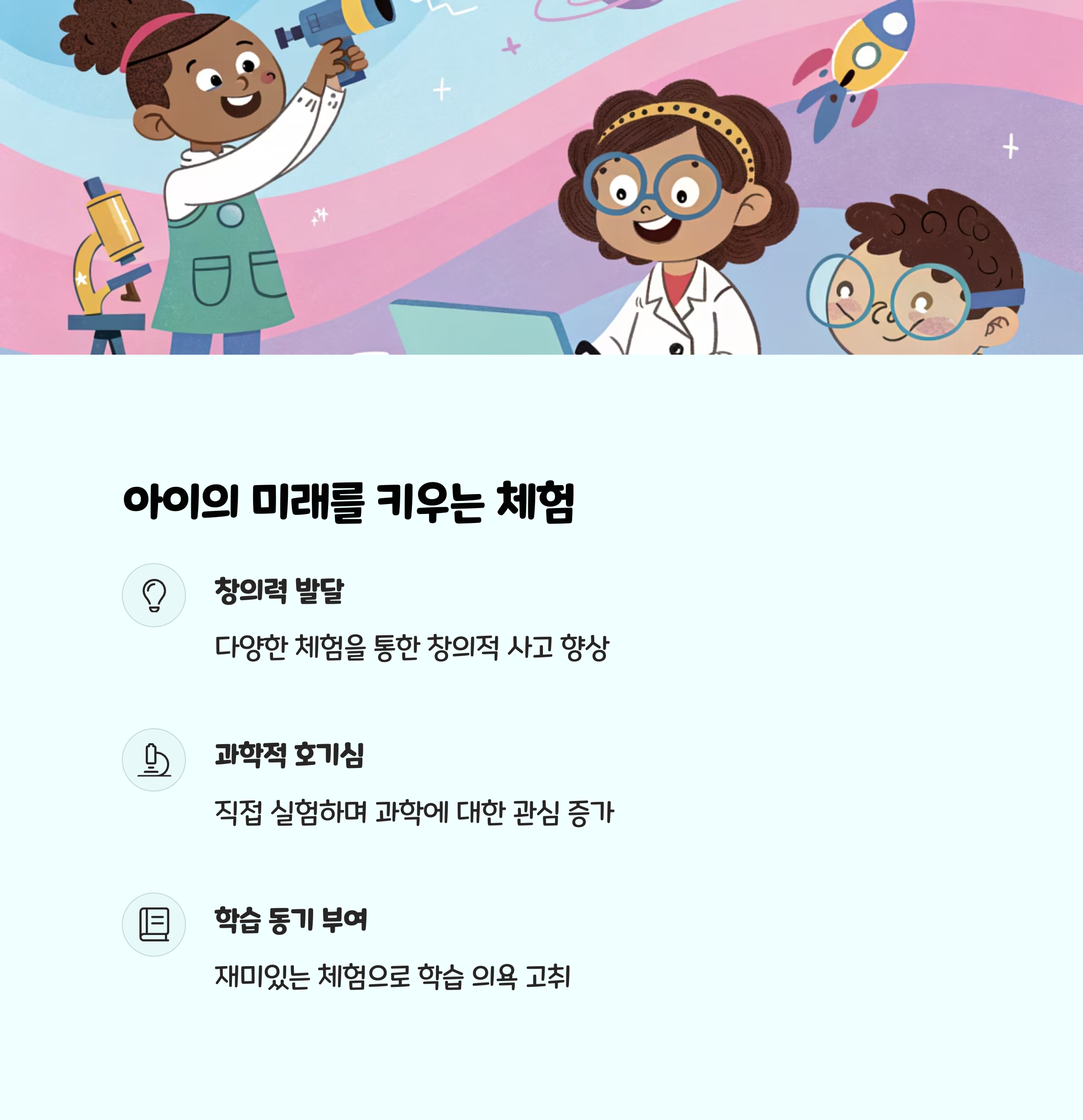 프로그램 시간: 오전 10시, 오후 1시, 3시교육 대상: 초등학생(보호자 동반 필수)주말과학교실: 6~7월 매주 토요일, 만 5세~초등 6학년 대상, 1일 3회(09:30, 13:30, 16:00)로 운영되어 원하는 시간에 맞춰 예약할 수 있습니다.