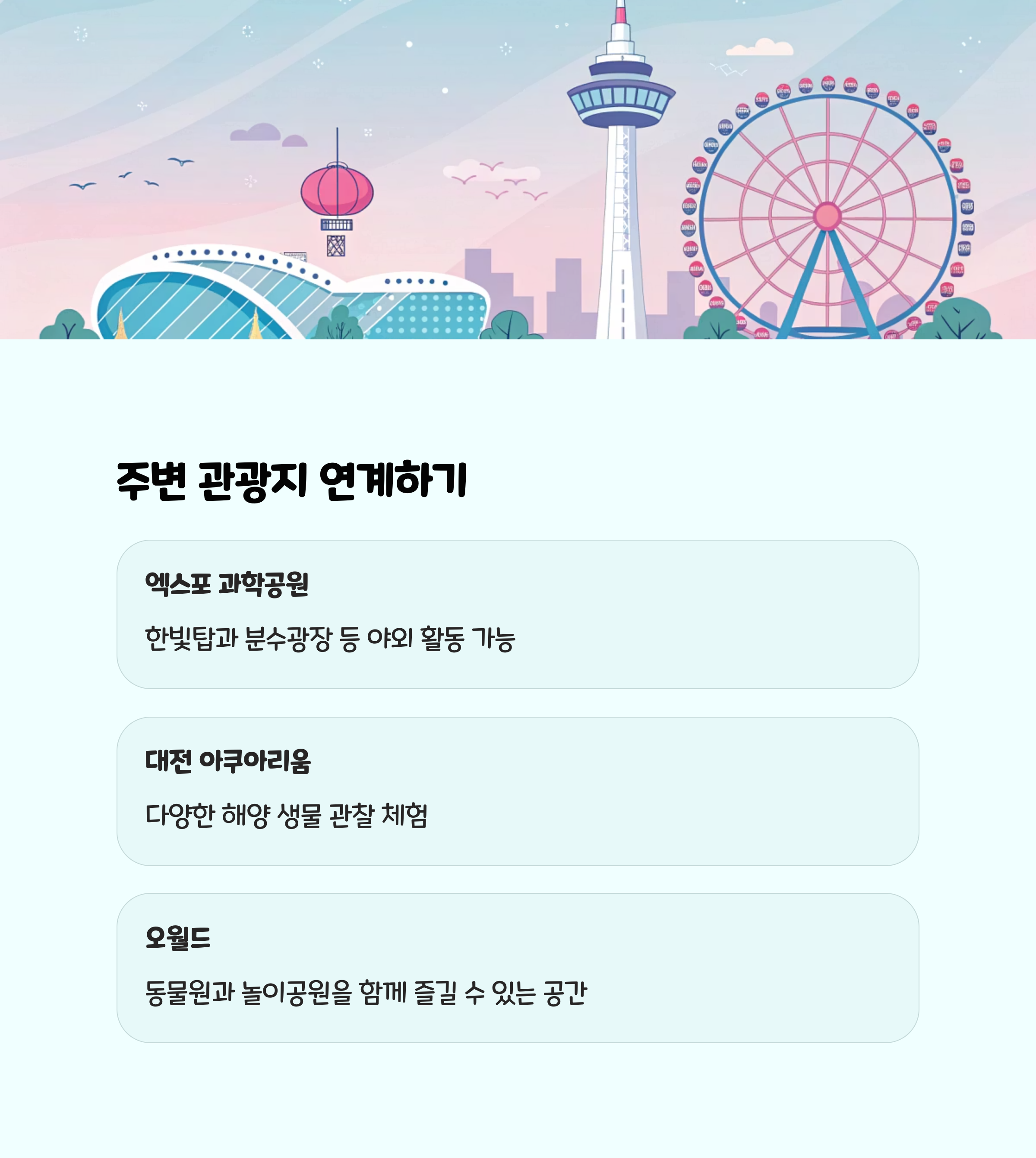 과학관 인근에는 한빛탑, 엑스포과학공원, 대전오월드 등 다양한 가족 여행지가 있습니다. 과학관 관람 후 인근 명소를 함께 방문하면 하루 종일 알차게 가족 여행을 즐길 수 있습니다.