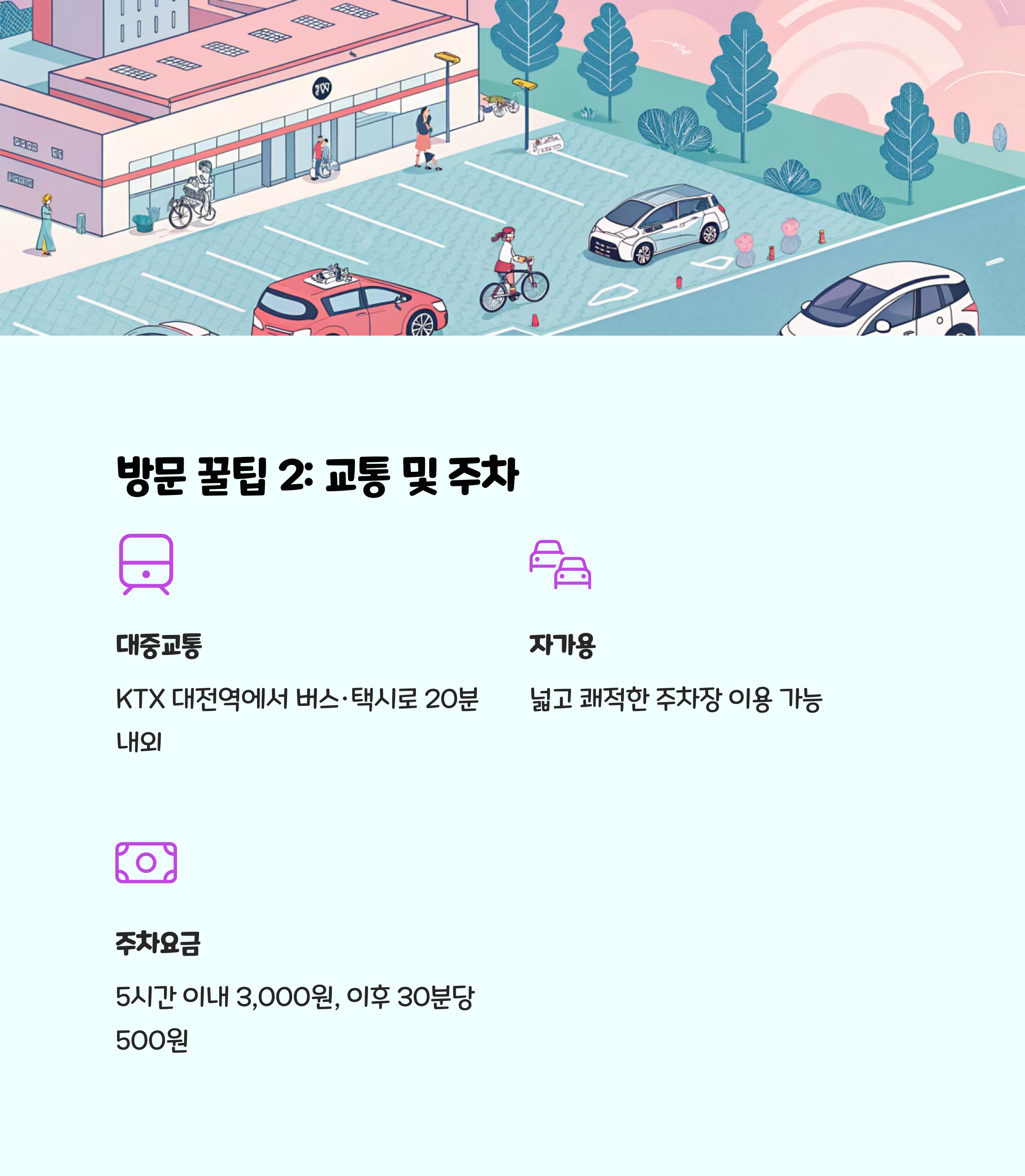 • 주차 및 교통: KTX 대전역에서 버스·택시로 20분 내외, 자차 이용 시 주차장 넓고 쾌적합니다.