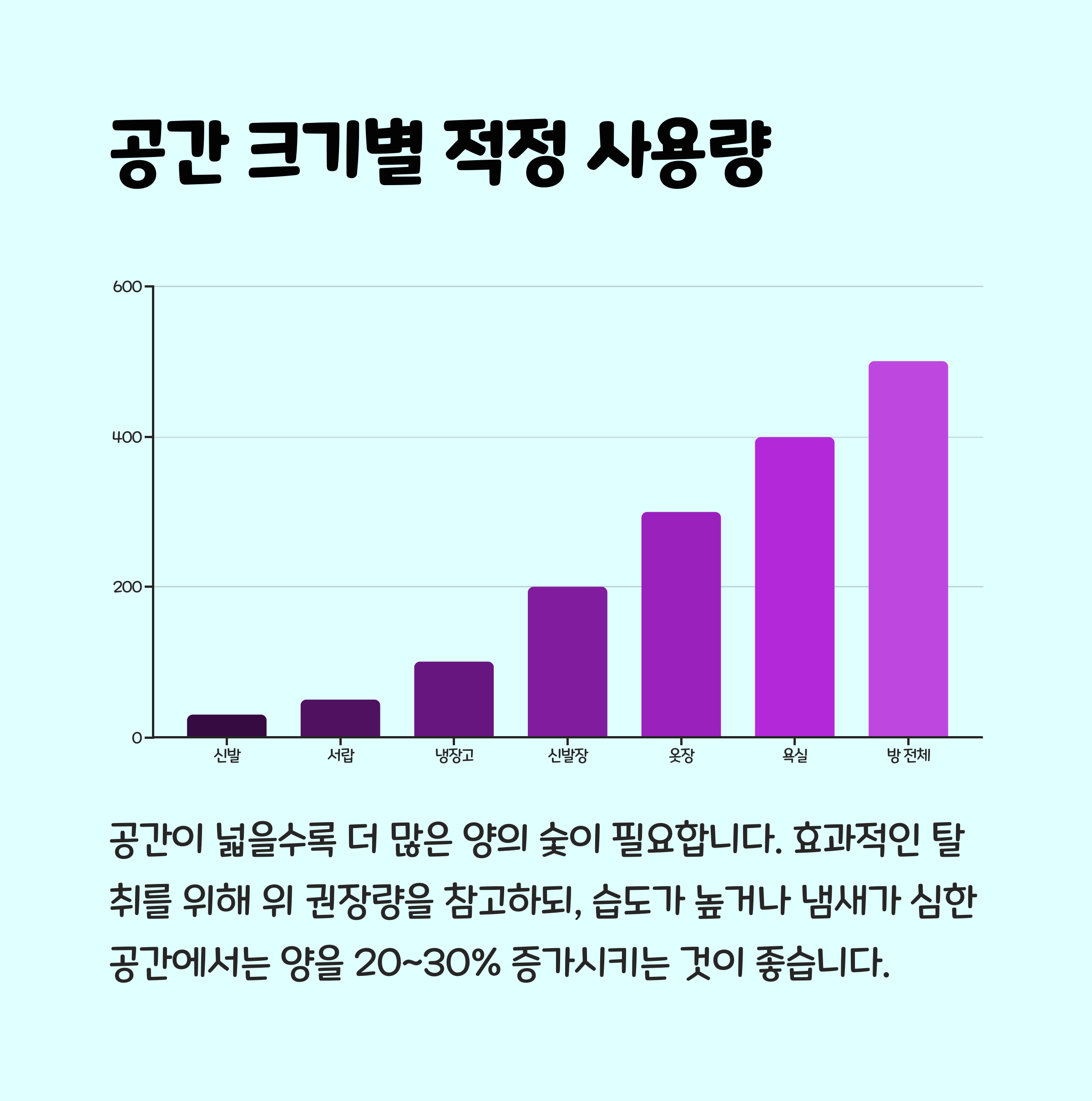 | 공간 | 권장 숯 사용량 (1Kg 기준) | 추천 교체 주기 | 관리 팁 |