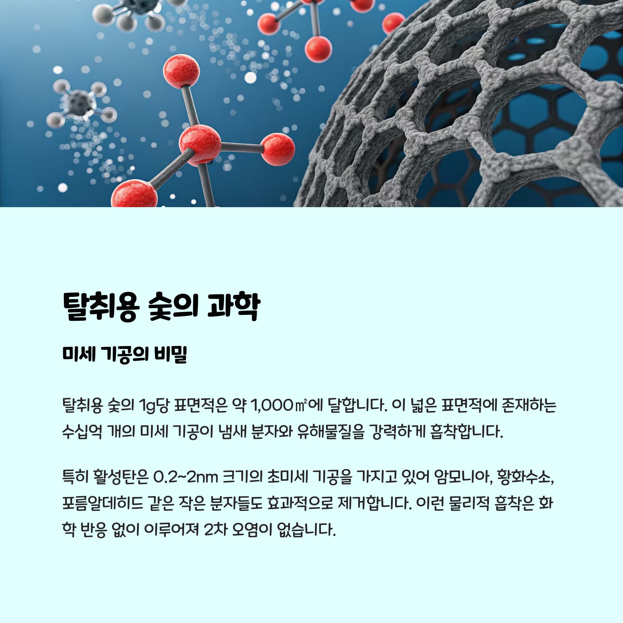 숯은 표면에 수많은 미세 기공(구멍)을 가지고 있어, 공기 중의 냄새 분자와 유해물질을 흡착하는 능력이 뛰어납니다. 특히 암모니아, 유기화합물 등 악취의 원인이 되는 물질을 효과적으로 제거하고, 습도 조절과 곰팡이 억제에도 도움을 줍니다. 이런 특성 덕분에 냉장고, 신발장, 옷장, 반려동물 화장실 등 다양한 공간에서 널리 사용됩니다.