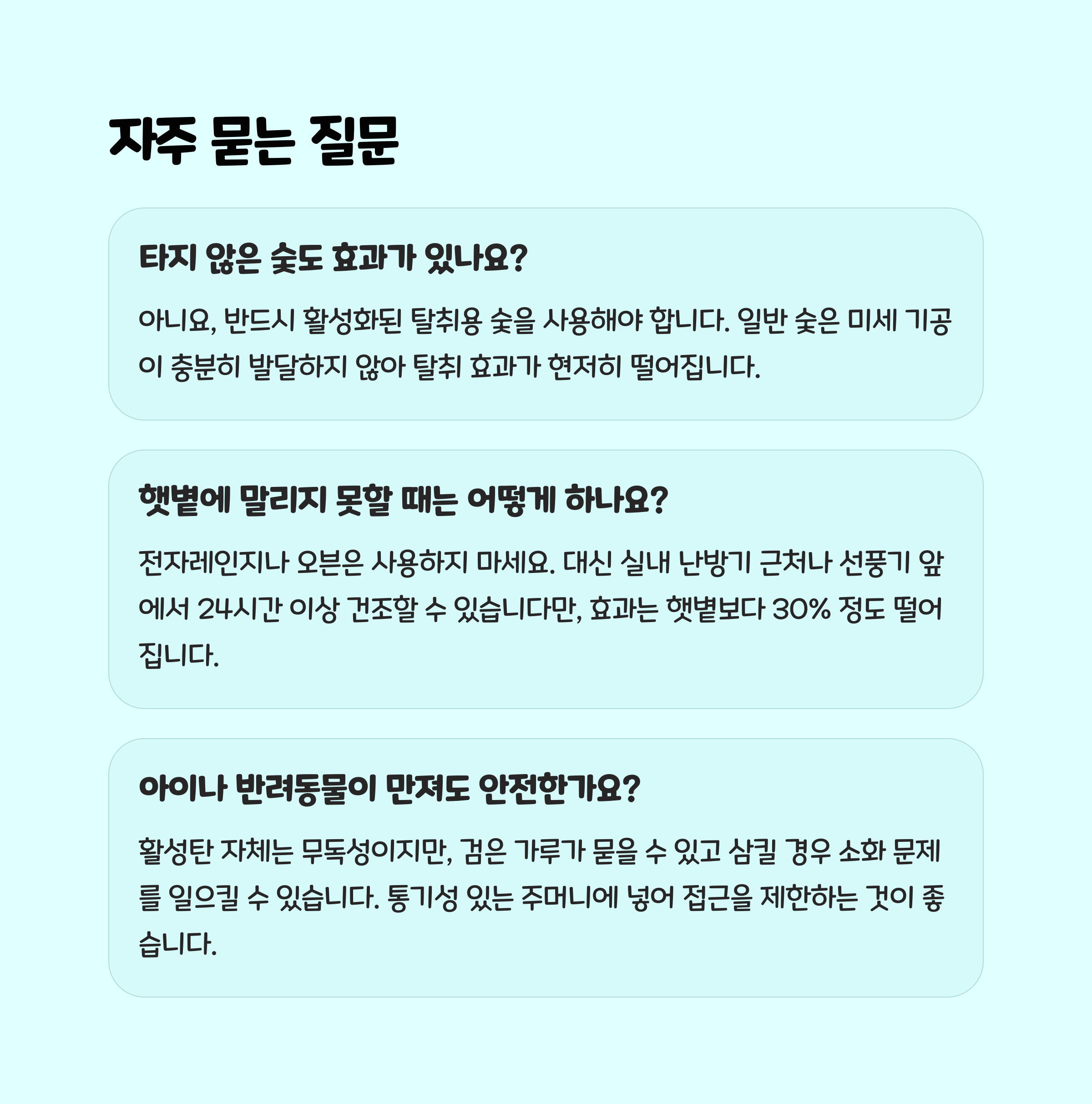 오래 사용한 숯은 표면의 기공이 냄새 분자, 먼지, 습기로 가득 차 흡착력이 거의 사라집니다. 이 상태의 숯은 더 이상 냄새를 제거하지 못하며, 오히려 미세먼지의 원인이 될 수 있습니다. 효과가 떨어진 숯은 새로 교체하고, 사용한 숯은 화분 흙에 섞어주면 토양 개선에 도움이 됩니다.