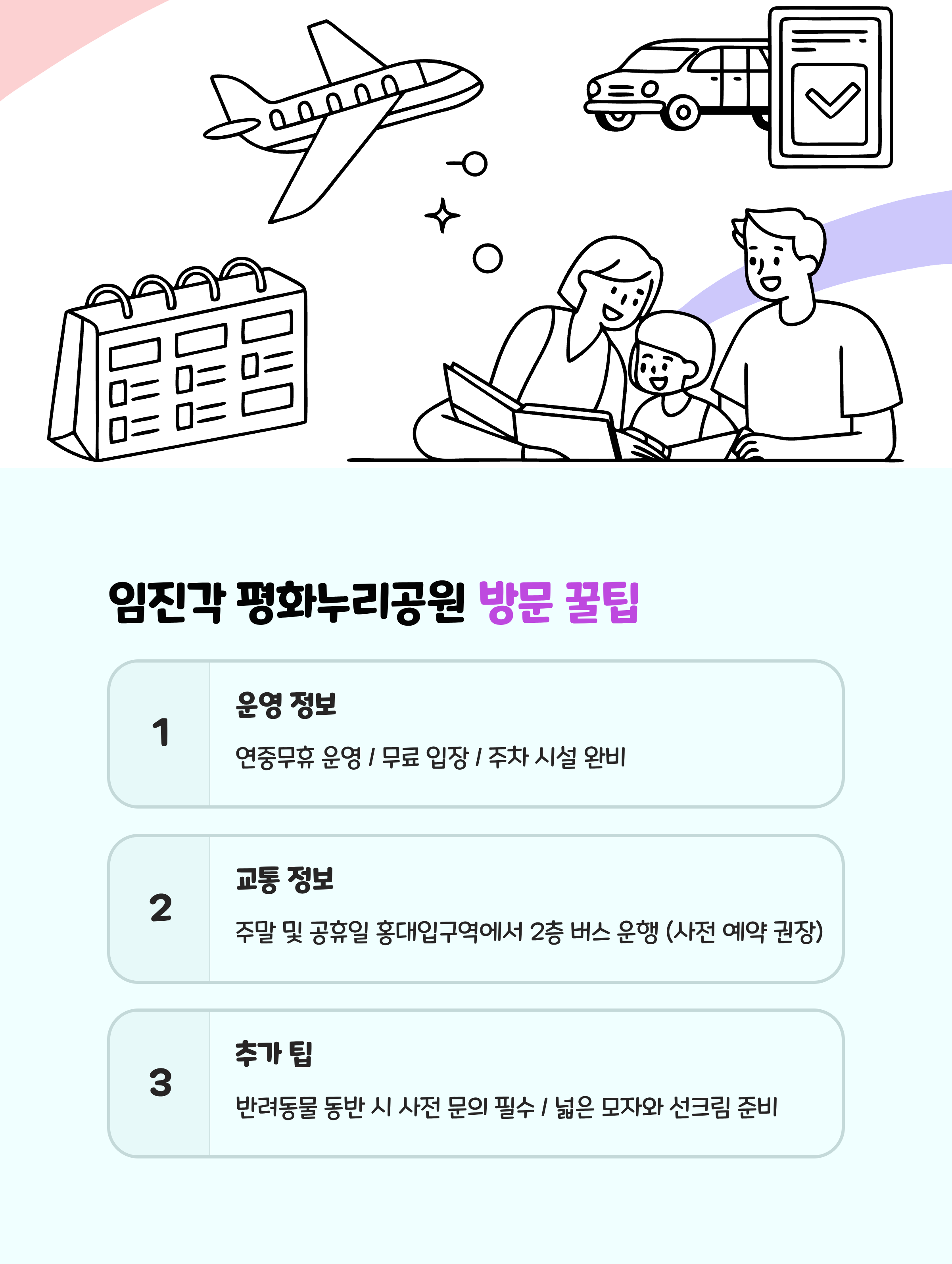 | 접근성 | 임진각 공영주차장 이용, 도보 이동 가능 | 유모차와 휠체어 동선도 편리 |
