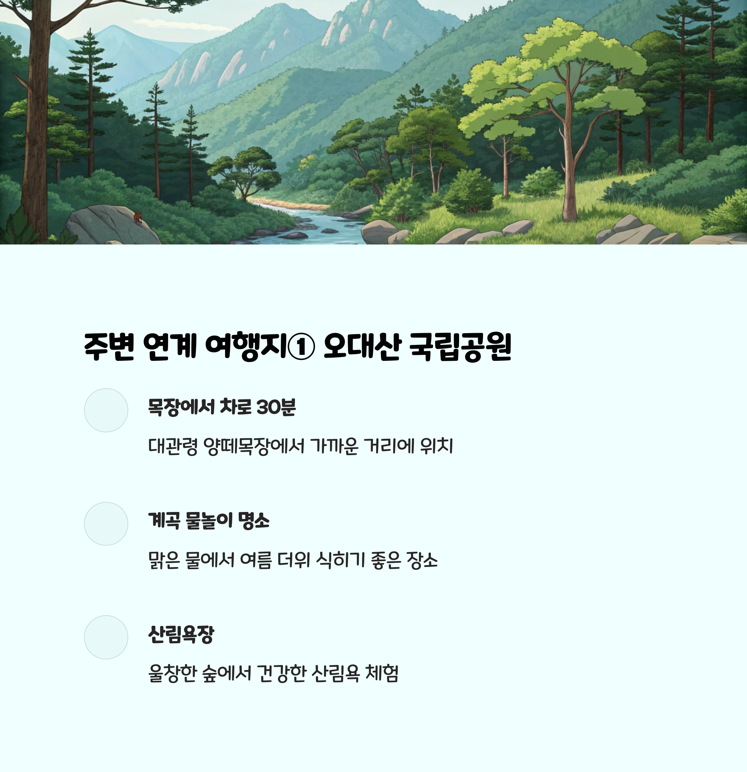 양떼목장 인근에는 오대산 국립공원, 허브나라 농원 등 다양한 자연·체험 명소가 가까워 당일치기 또는 1박 2일 코스로 연계 여행이 가능합니다. 평창 시내에는 맛집과 카페도 많아, 여행의 즐거움을 더해줍니다.