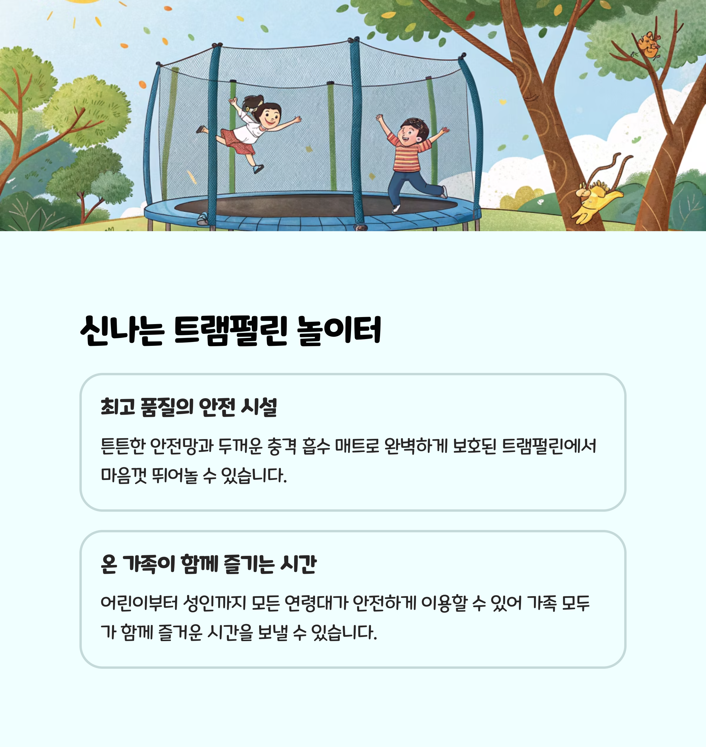 | 트램펄린 | 대형, 안전설계, 잔디공원과 연계, 다양한 놀이시설 | 상시 이용 가능 |